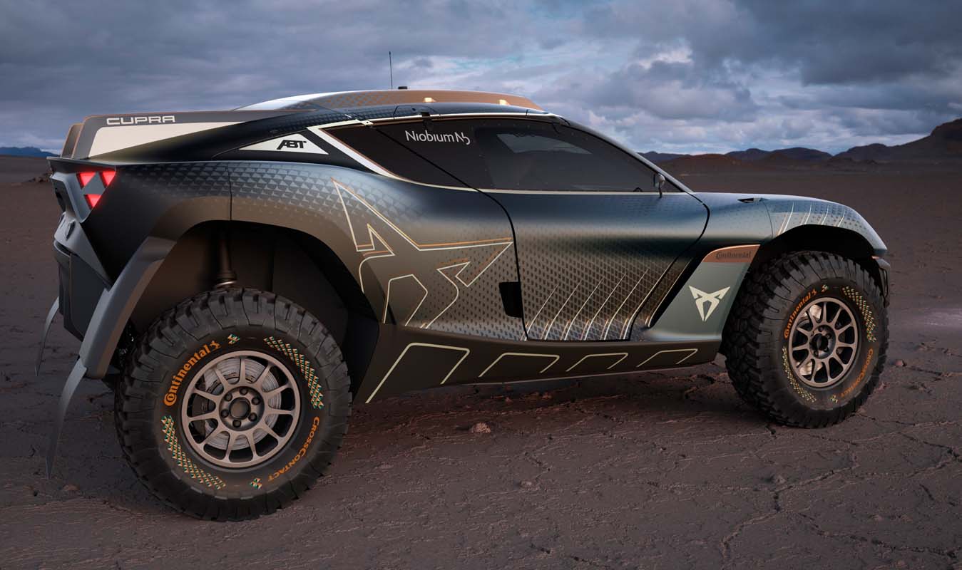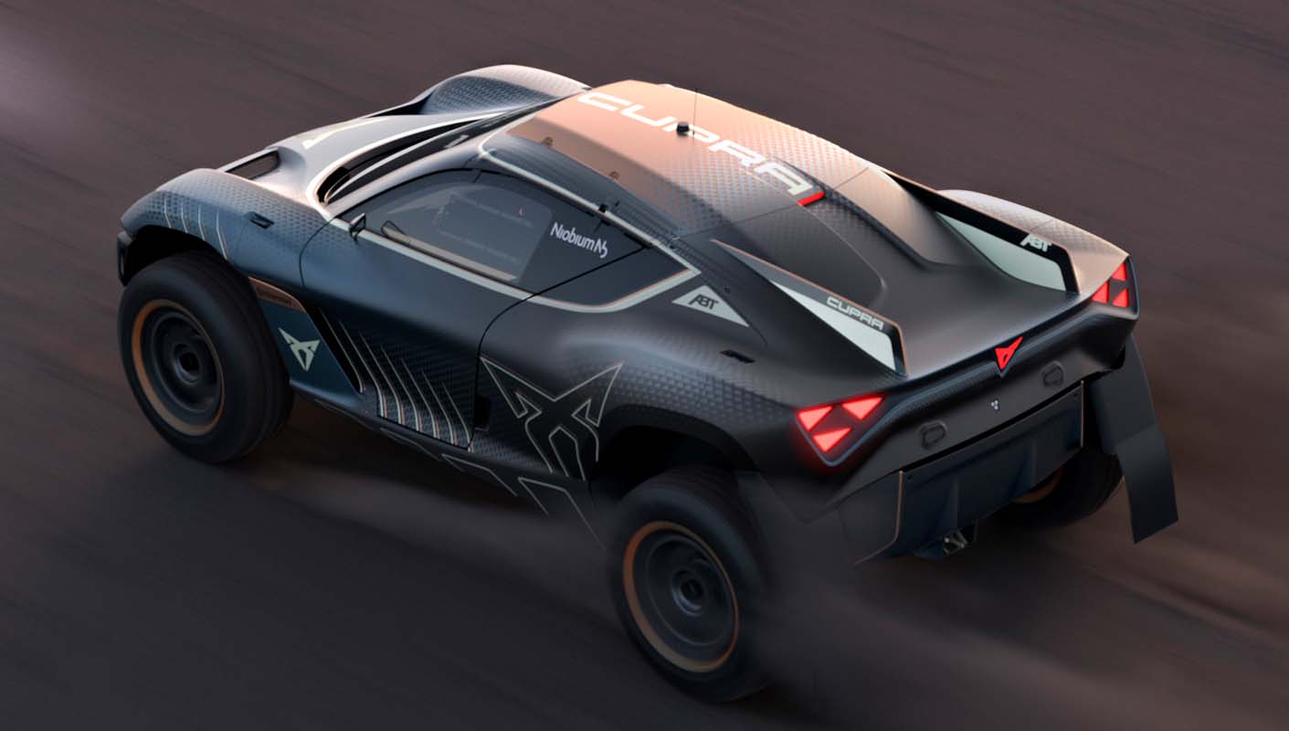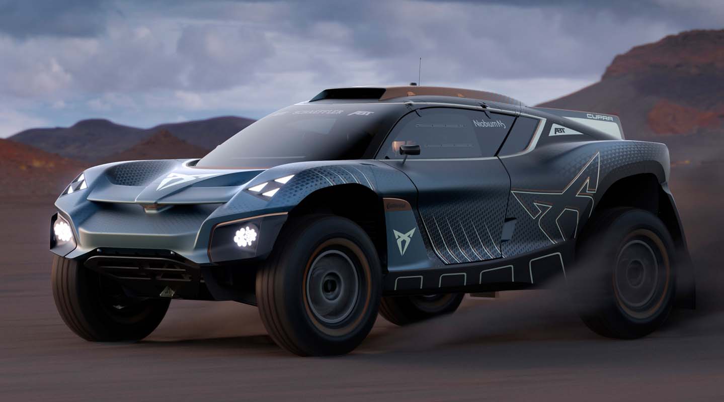 The all-electric off-road racecar is finished with copper accents – a time-honoured CUPRA mark, parametric texturing and dynamized lines to help the exterior shimmer and move as the vehicle shifts through the landscape and an overlapping CUPRA logo to create a powerful 3D effect.