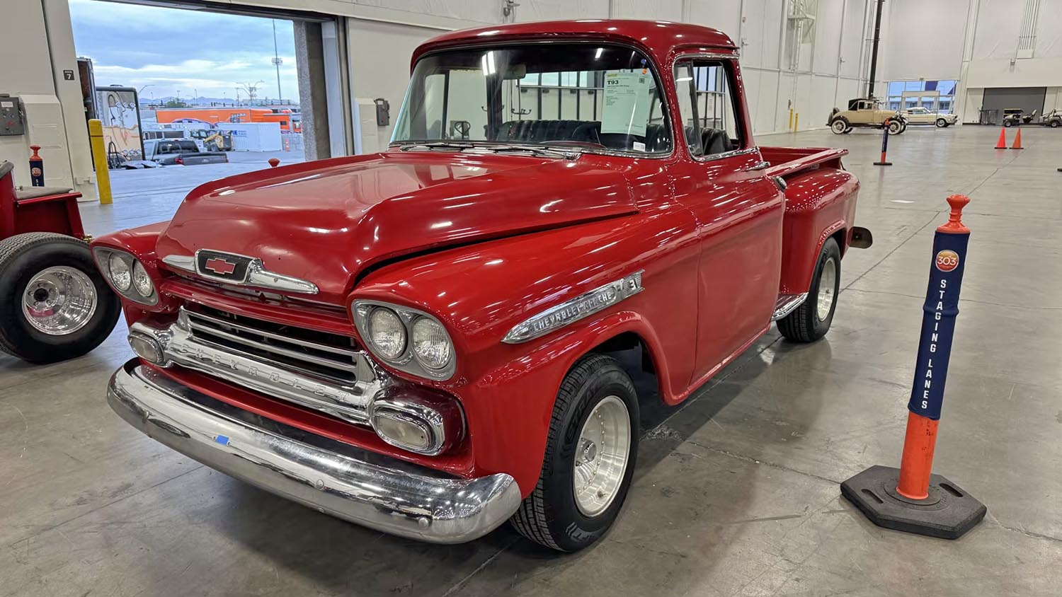 This custom 1955 Chevrolet 3200 Pickup is a skillfully executed restomod blending two design eras with modern V-8 power. Key features include the unique 1958 Chevrolet front clip, a powerful 350 CI V-8 engine, and a Turbo 350 automatic transmission. The truck has a solid restoration frame and a strong 10-bolt rear differential. Finished in classic Red over Black, this New Mexico truck is a solid, eye-catching build. This classic custom pickup, Lot T93, is scheduled to cross the block on Thursday, November 13th, at Las Vegas 2025.