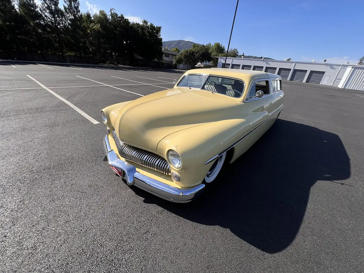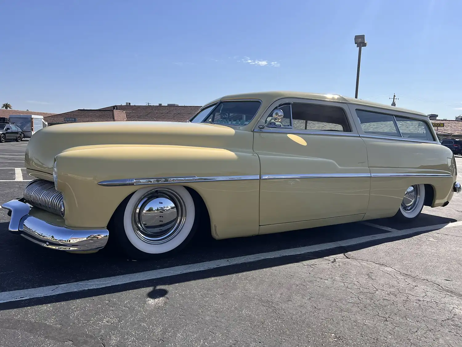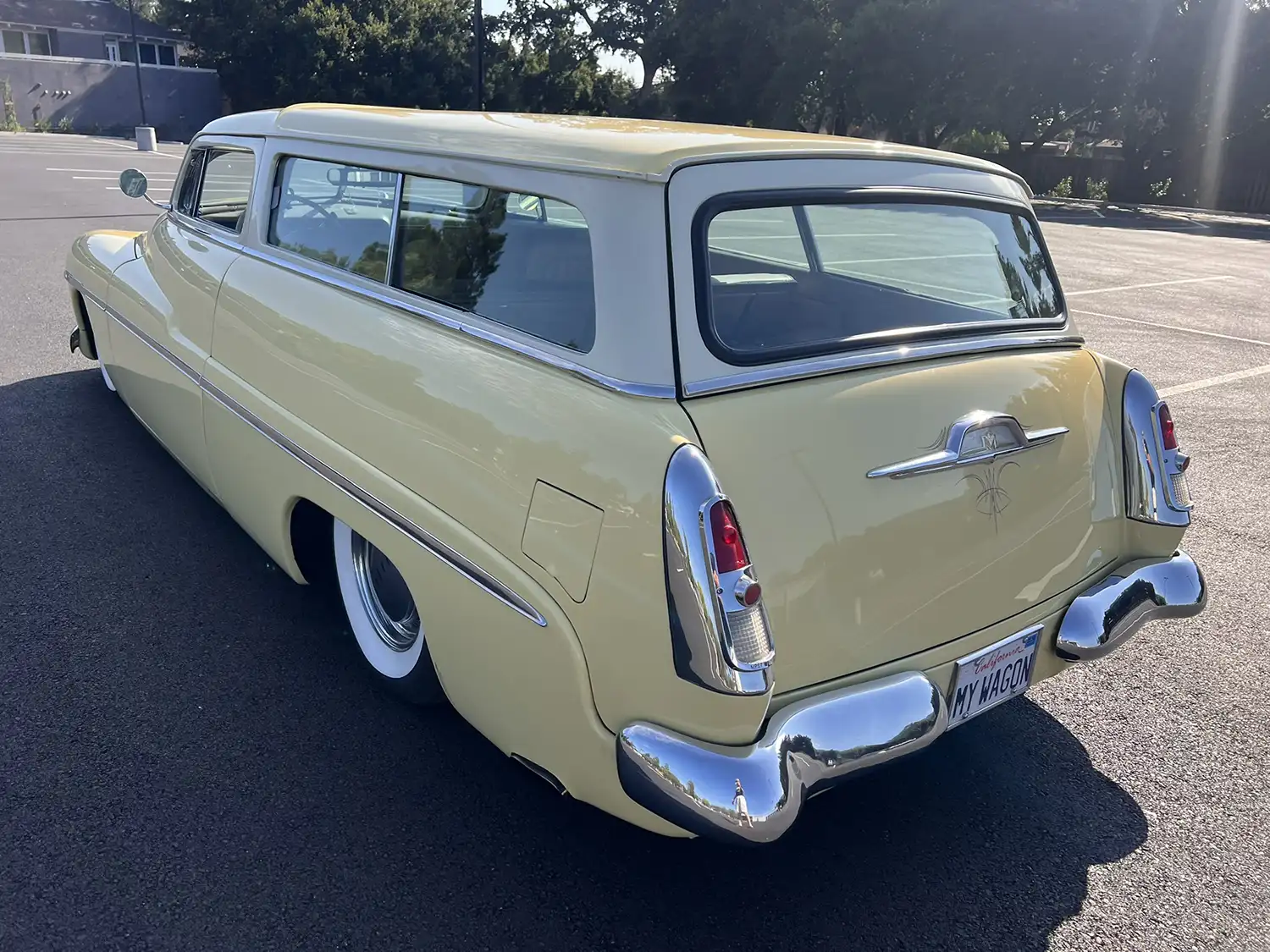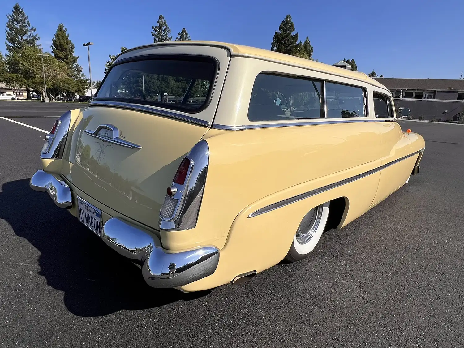 Radical Redesign: A Wagon’s Unique Configuration The transformation involved chopping the windshield and doors, fabricating quarter panel extensions, fitting a Ford station wagon roof, and shaving the door handles. The car was then refinished in yellow with white panels surrounding the windows, creating a striking two-tone aesthetic. Additional modifications include faired-in headlights, rolled front and rear pans, a modified grille, and custom-fabricated glass. Chrome 14-inch steel wheels with wide-whitewall tires and dice-style valve stem caps enhance the car’s custom appearance.