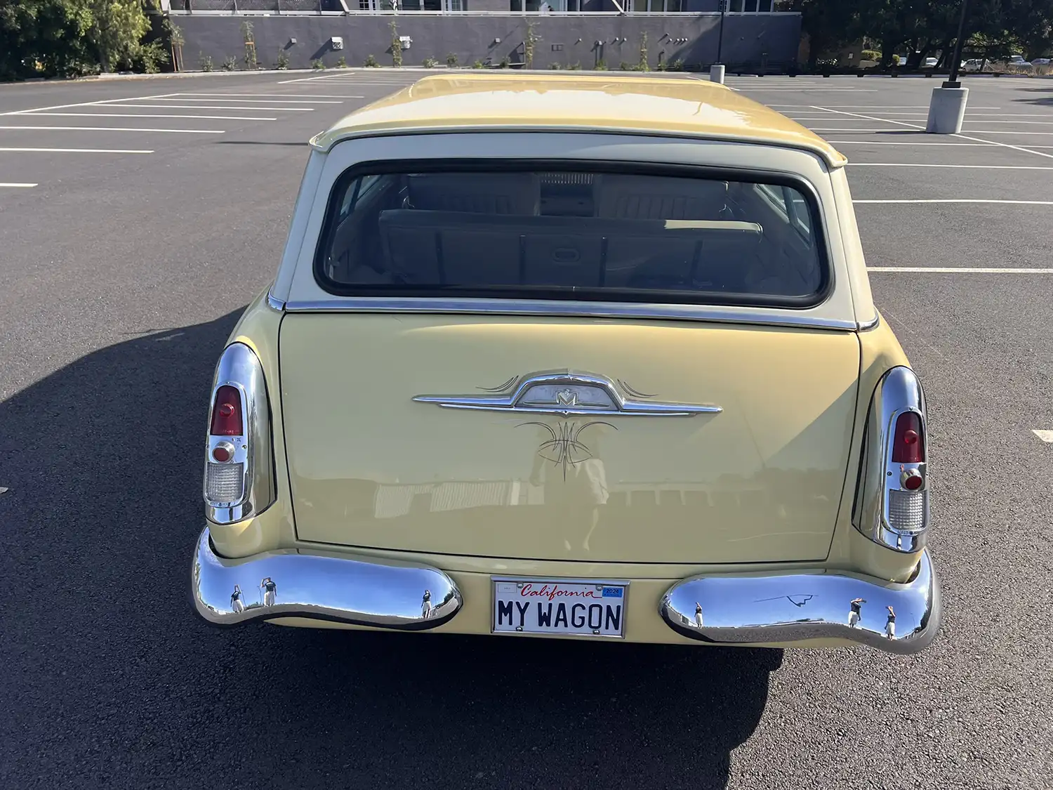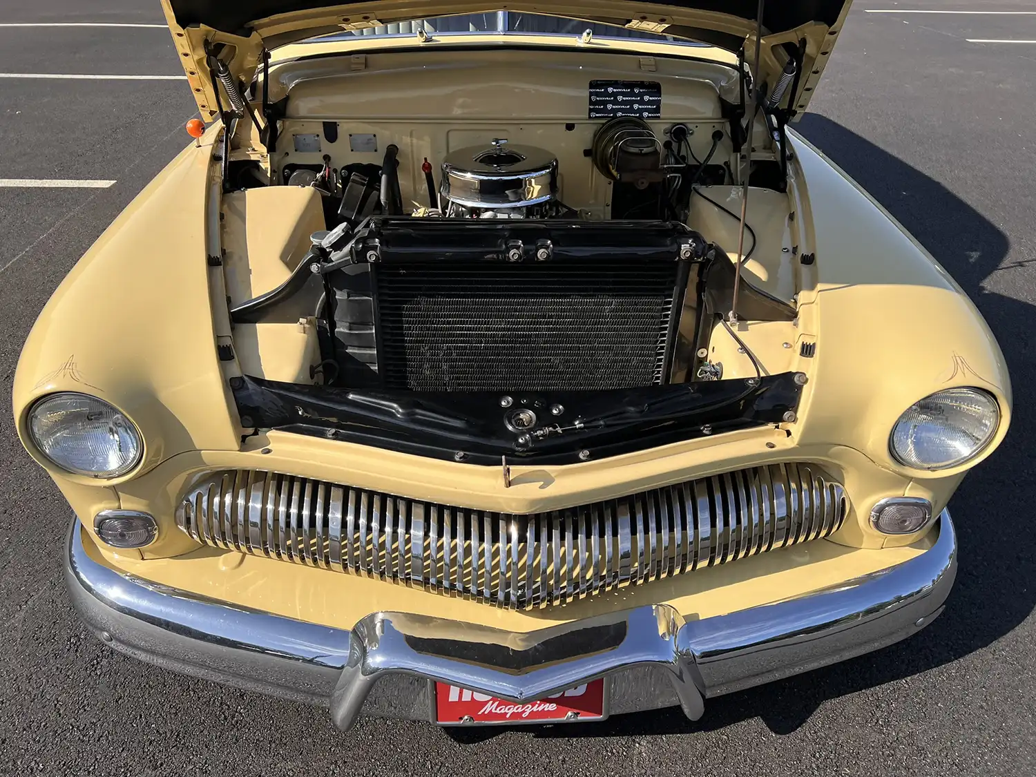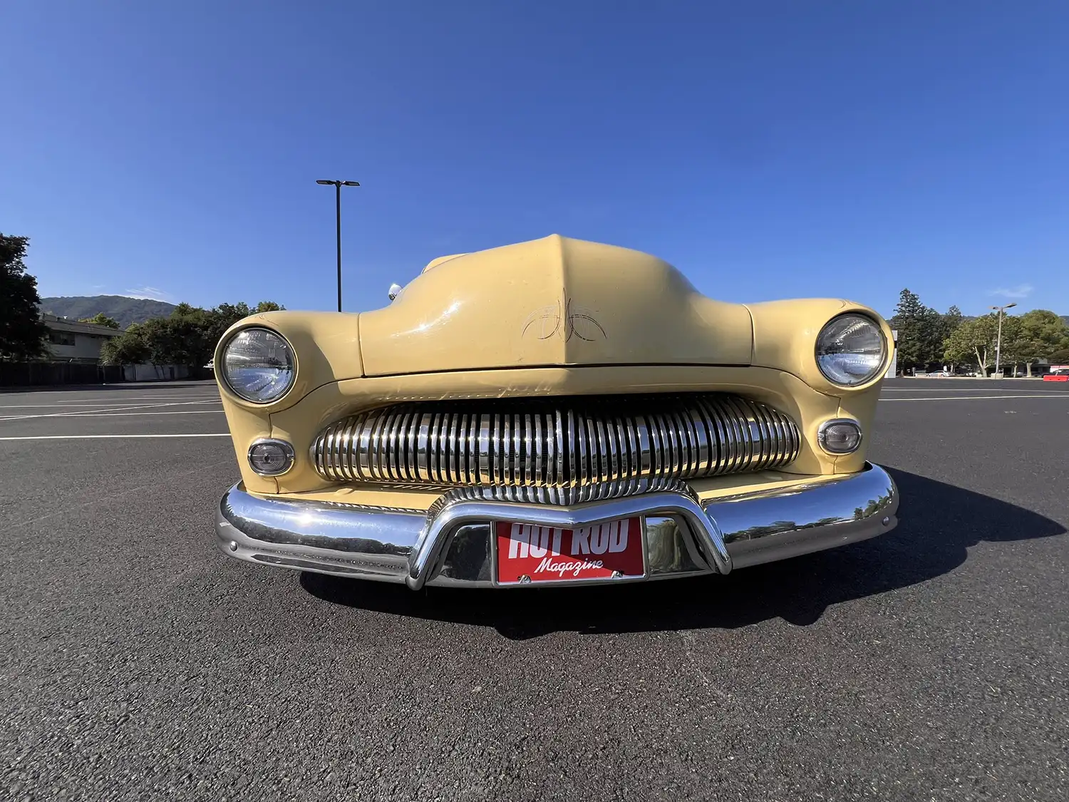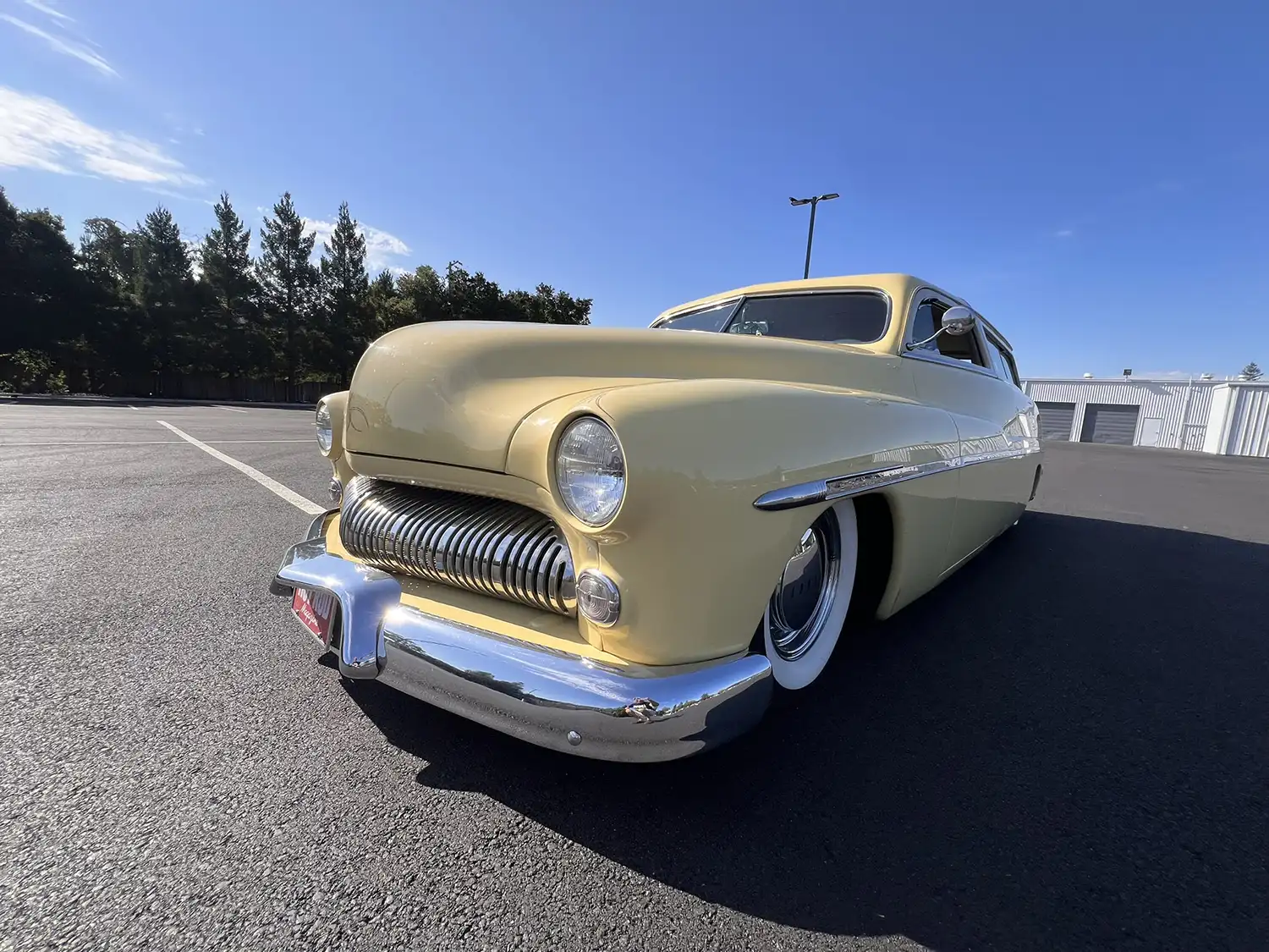 Radical Redesign: A Wagon’s Unique Configuration The transformation involved chopping the windshield and doors, fabricating quarter panel extensions, fitting a Ford station wagon roof, and shaving the door handles. The car was then refinished in yellow with white panels surrounding the windows, creating a striking two-tone aesthetic. Additional modifications include faired-in headlights, rolled front and rear pans, a modified grille, and custom-fabricated glass. Chrome 14-inch steel wheels with wide-whitewall tires and dice-style valve stem caps enhance the car’s custom appearance.