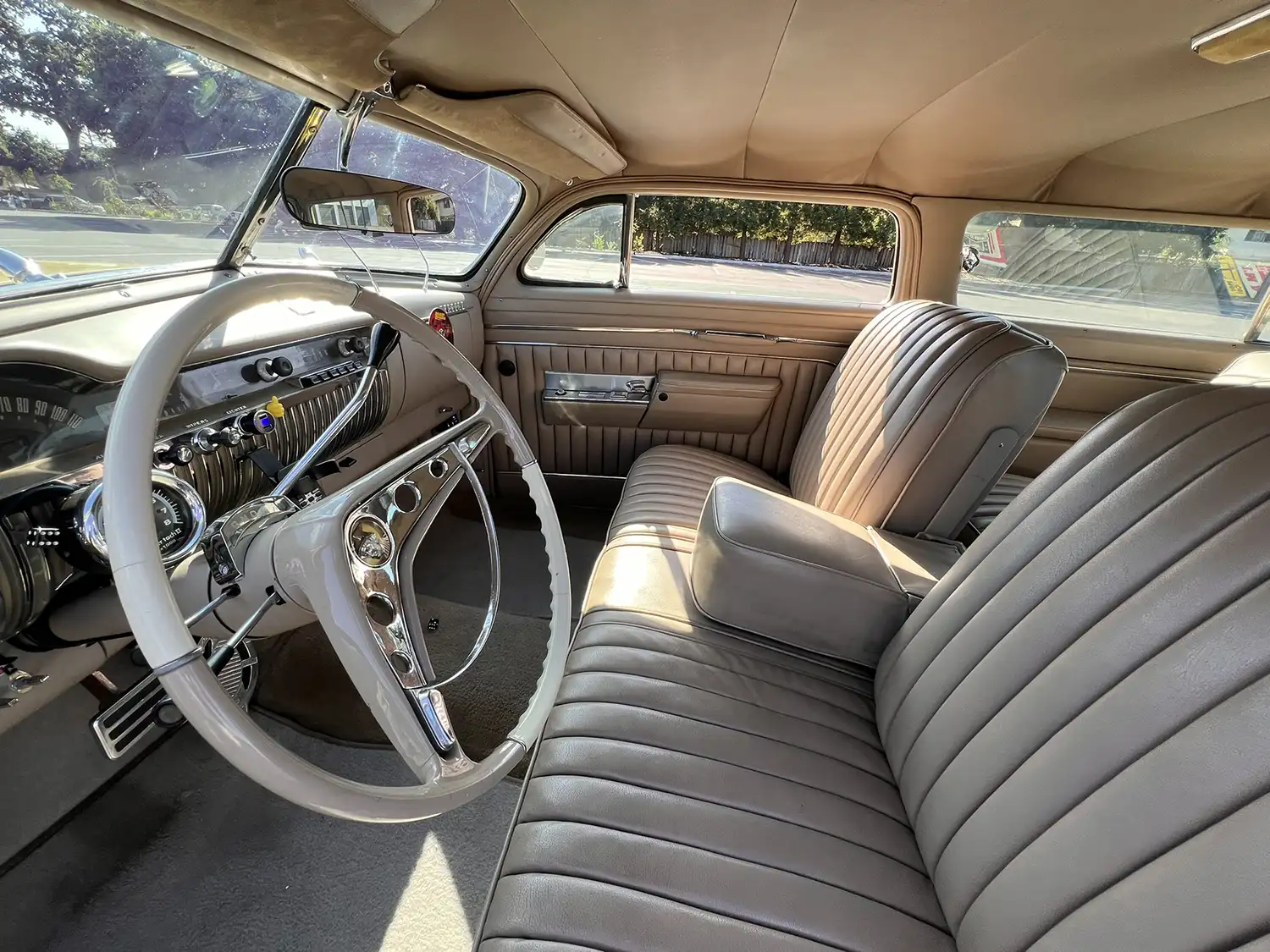Luxurious Interior: Crafted for Comfort and Style Inside, the cabin features a 1965 Buick-sourced front bench and 1956 Ford wagon rear bench, upholstered in beige vinyl. Power front windows, a power-adjustable front seat, and USB power ports add to the car’s modern conveniences. A Pioneer CD stereo, concealed behind a hinged panel on the dash, provides entertainment. Stewart-Warner gauges, modified to fit behind the instrument panel, and a column-mounted Sun tachometer enhance the driver’s experience.