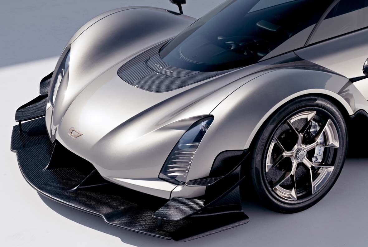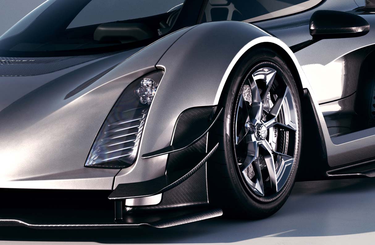 The hypercar has a top speed up to 281 mph in optional low drag vmax configuration. Putting the driver and passenger in the center position for ultimate weight distribution, aero and driver engagement, its quarter mile time is 8.1 seconds, and it goes 0 to 62 mph (0 to 100 kph) in 1.9 seconds; 0 to 186 mph (300 kph) to 0 in 13.8 seconds and 0 to 248 mph (400 kph) to 0 in 27.1 seconds; 0 to 186 mph (300 kph) in 8.5 seconds; and 0 to 248 mph (400 kph) in 21.3 seconds. It has a >3:1 Lift / Drag Ratio with 615 kg downforce @ 100mph and 2,500 kg @ 200mph (high downforce configuration).