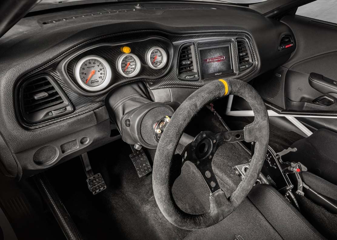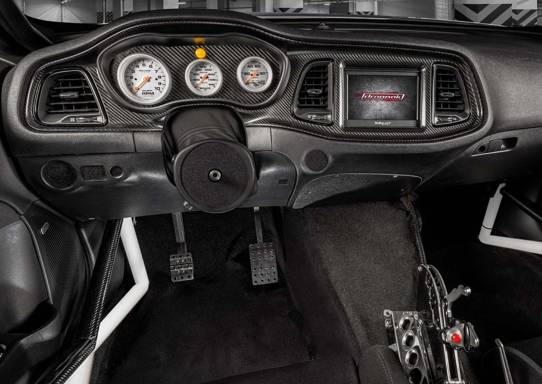 An all-new motorsport electrical architecture setup includes the “brains” of the supercharged HEMI powertrain in the programmable Holley Dominator Electronic Fuel Injection (EFI) vehicle-management system. In addition, a programmable Racepak Smartwire Power Distribution Module controls all electrical components using solid-state electronics, which eliminates the need for fuses and relays. These electronic modules are conveniently mounted to the body using bespoke mounts that allow for easy service with factory fit-and-finish.