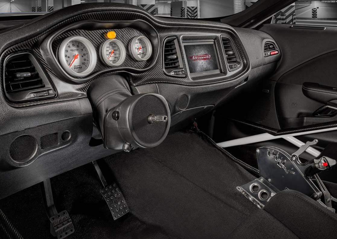 On the passenger side, a custom red and chrome Drag Pak serialized badge signifies the one-of-50 build sequence numbers. Driver comfort is achieved with the adjustable mounts that are included for the seats and racing pedals. Driver control is delivered through a mechanical floor shifter and lightweight steering column with quick-release steering wheel.