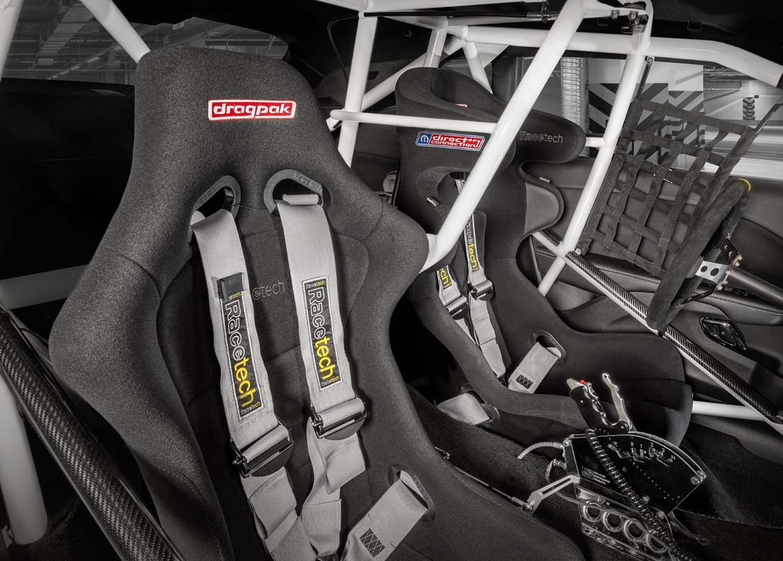 A choice of lightweight Racetech composite seats and Racetech HANS-ready cam-lock harnesses are FIA- and SFI-compliant. Both driver and passenger seats feature the Drag Pak logo embroidered on the seat back, while the optional Head Restraint Seat Package features a winged driver seat.