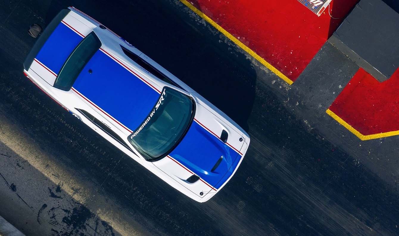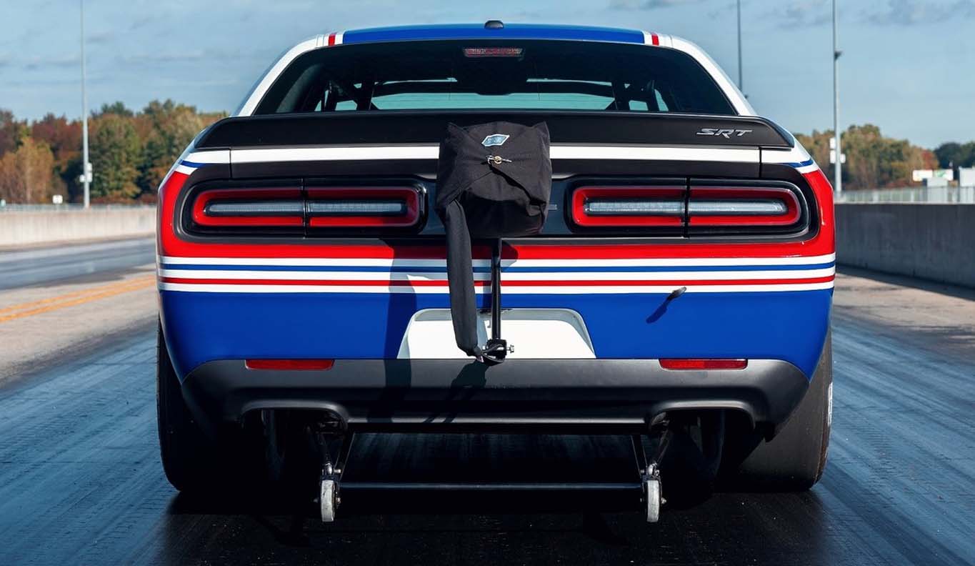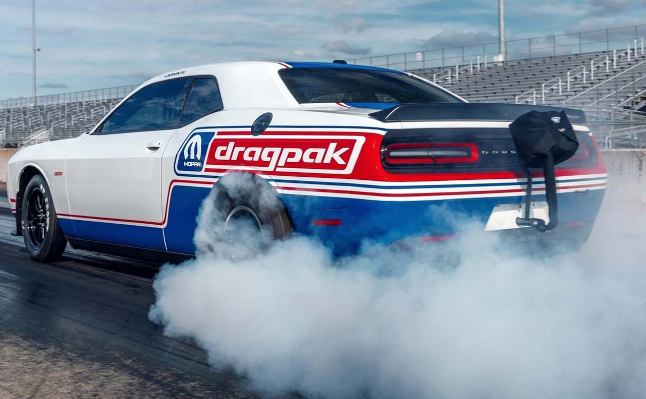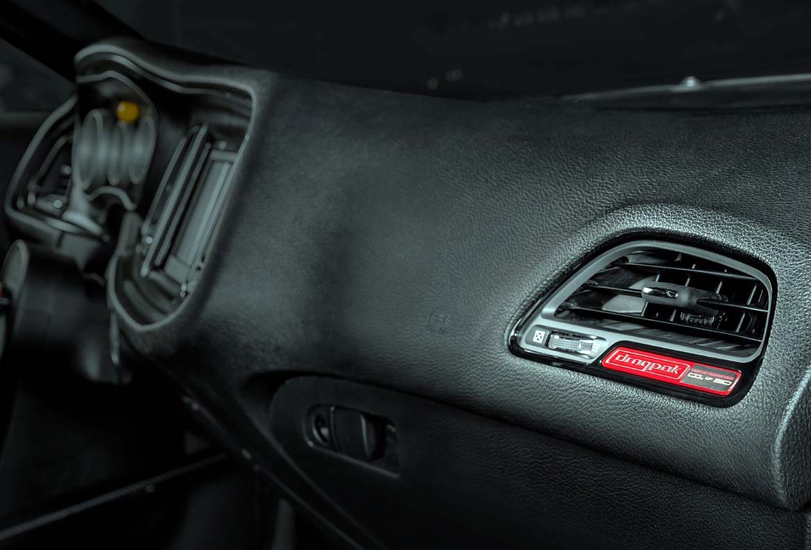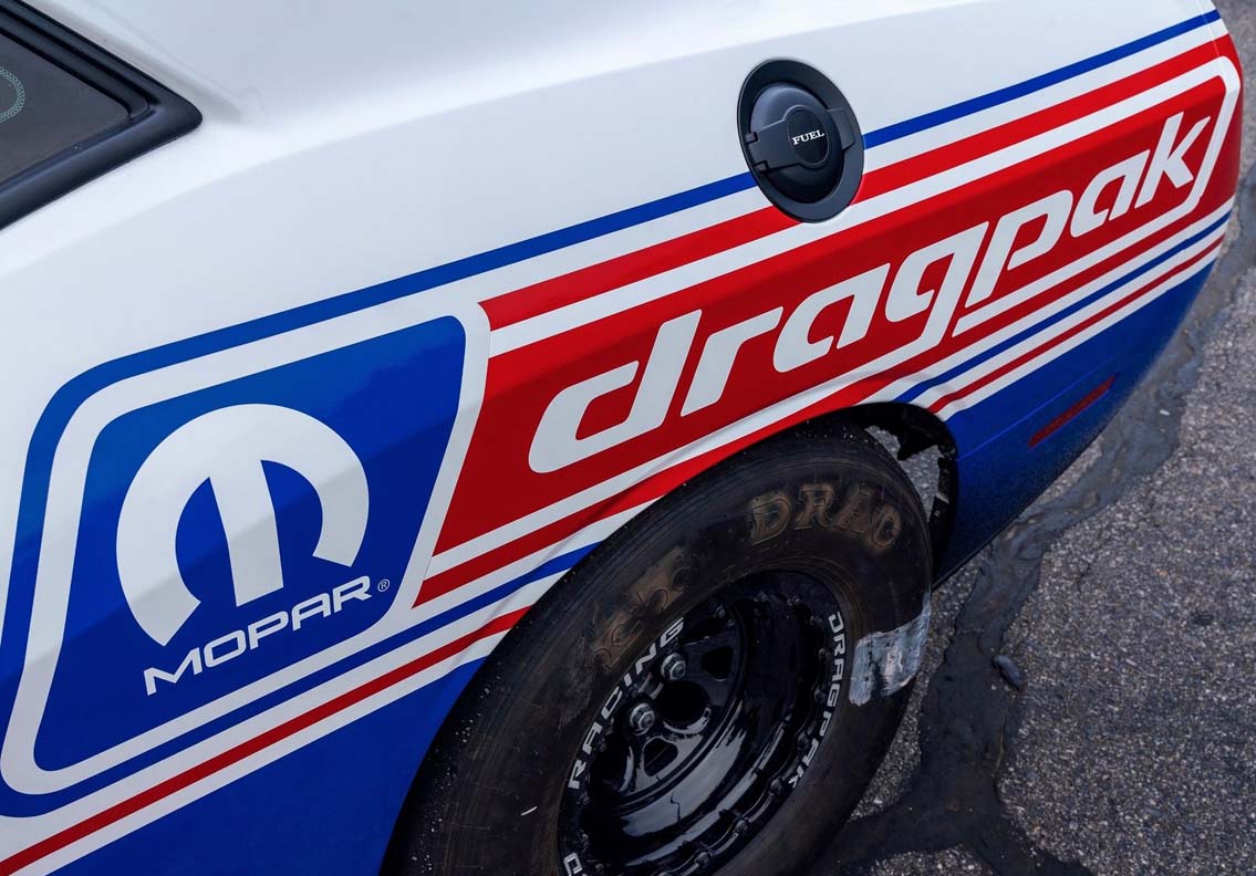 The new Drag Pak comes standard in White Knuckle and is available in five optional high-impact exterior colors: Hellraisin, Pitch Black, Smoke Show, TorRed and Frostbite. Full-color or monochromatic graphics packages are anchored by the Mopar logo and additional “drag pak” or “direct connection” billboard graphics on the quarter panels above the rear wheels. The graphic band wraps around the rear of the car, visually connecting both sides of the vehicle.