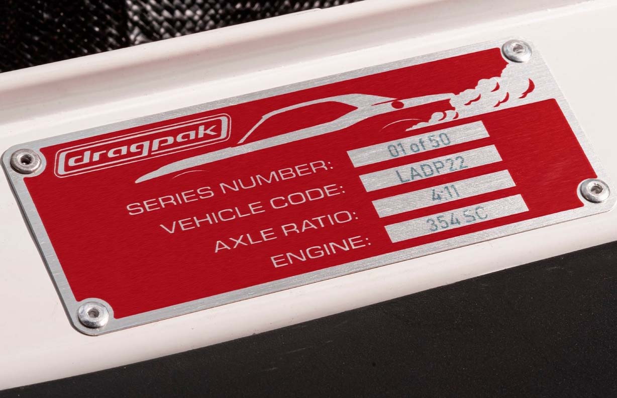 A unique, serialized, red and chrome Drag Pak badge sits atop the machined aluminum supercharger cover. Also under the aluminum hood, enthusiasts will see a nod to past 1970-1974 ‘Cuda and Challenger heritage models, with a special red and chrome radiator support “fender tag” adorned with the silhouette of the Challenger, stating the series number, the vehicle code, axle ratio and engine designation – all unique to the Drag Pak.