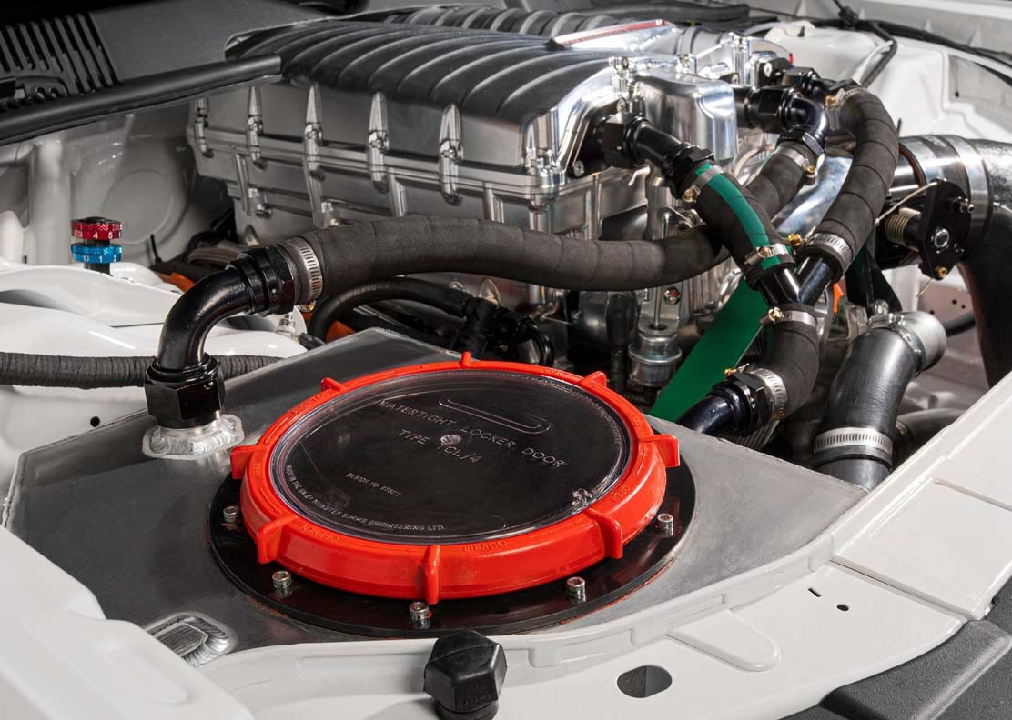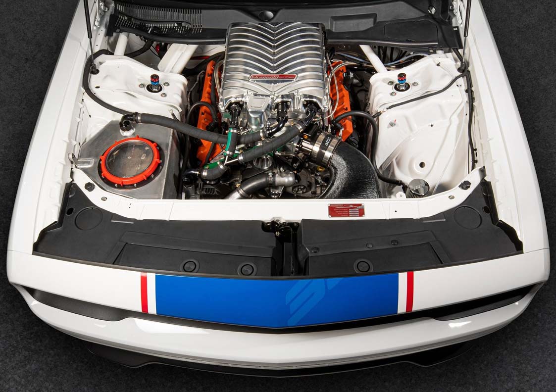 Numerous enhancements include an all-new 3.0-liter Whipple twin-screw supercharger, upgraded forged internals, new front accessory drive and a new fabricated aluminum ice tank with a clear lid that cools the supercharger intercooler. The engine combination has been fully validated by Mopar engineers on the dyno, as well as the drag strip, and is approved for the NHRA FSS and NMCA classes.