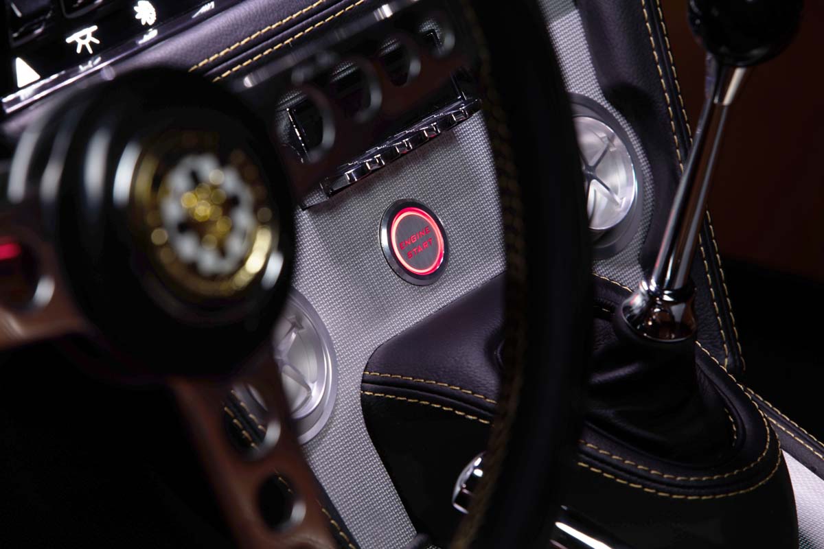 A piano black dashboard fascia parallels the aluminium centre console, housing many vehicle controls. The driver is greeted with gauges embellished with chrome, illuminated by LEDs.