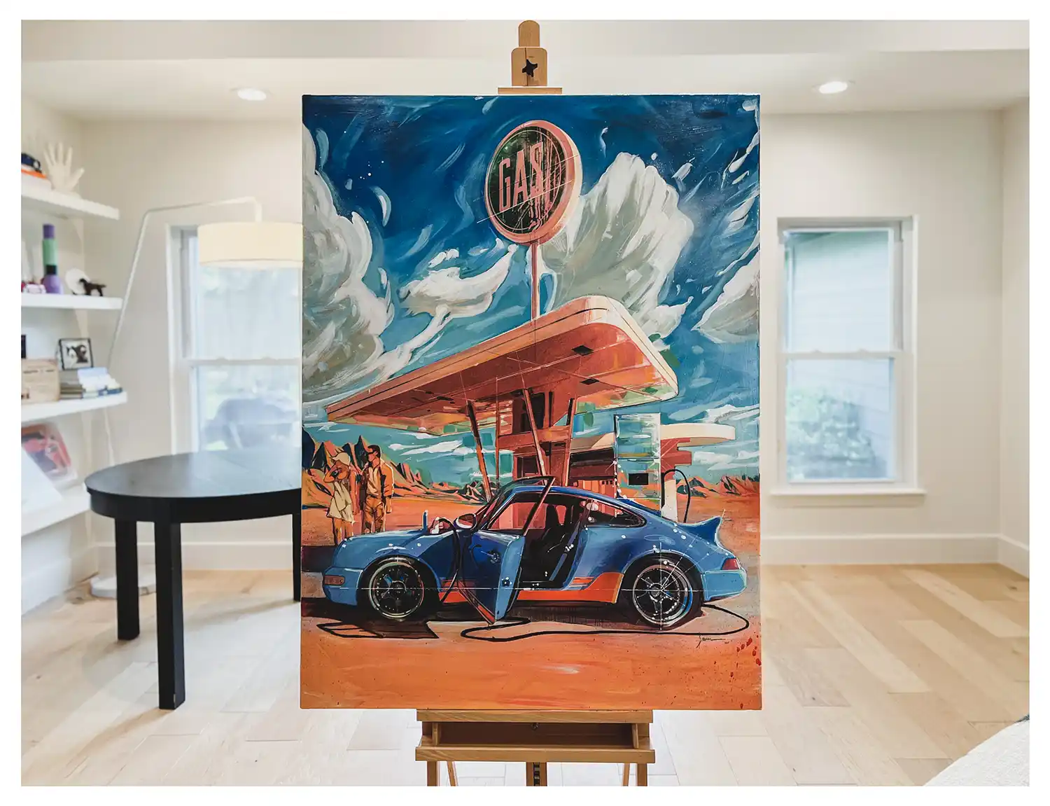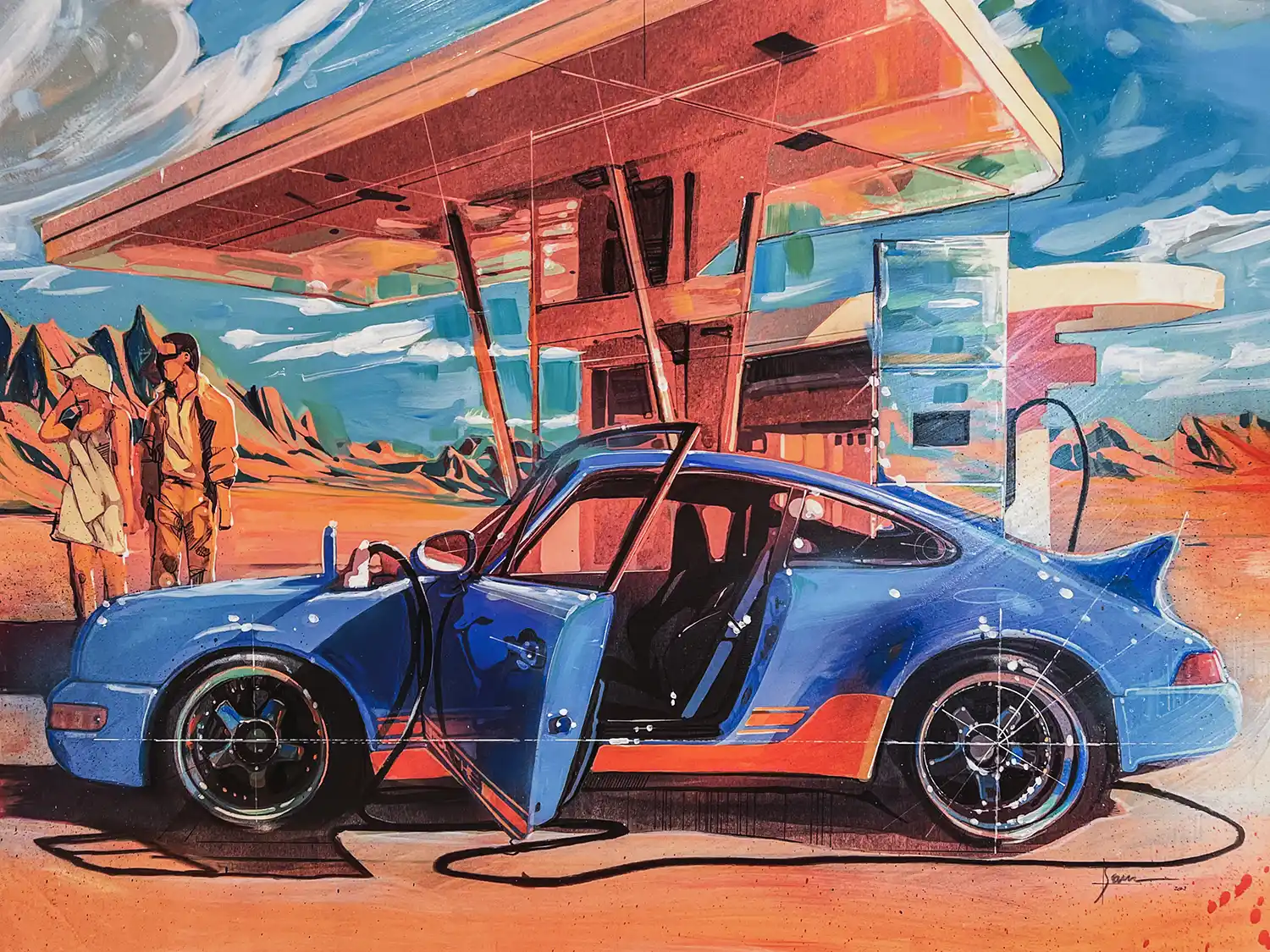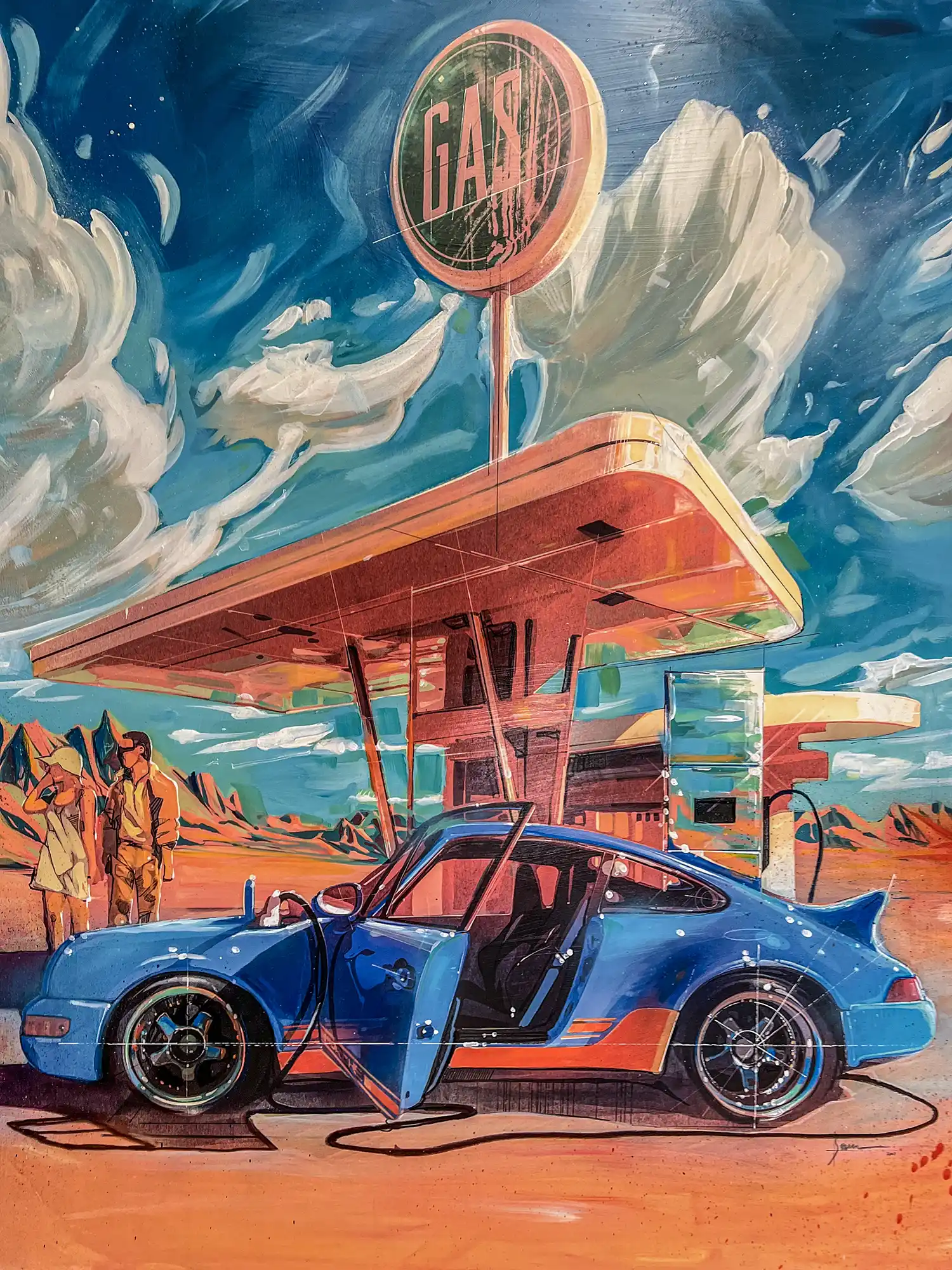 His artwork showcases a captivating scene where our cherished automobiles have transcended their reliance on gasoline. In this visual narrative, a couple embarks on a holiday, recharging at a decommissioned gas station. The station exudes a charming 1950s American aesthetic, where a chrome-plated charging monolith, occupying the station’s footprint, serves as a striking centrepiece.