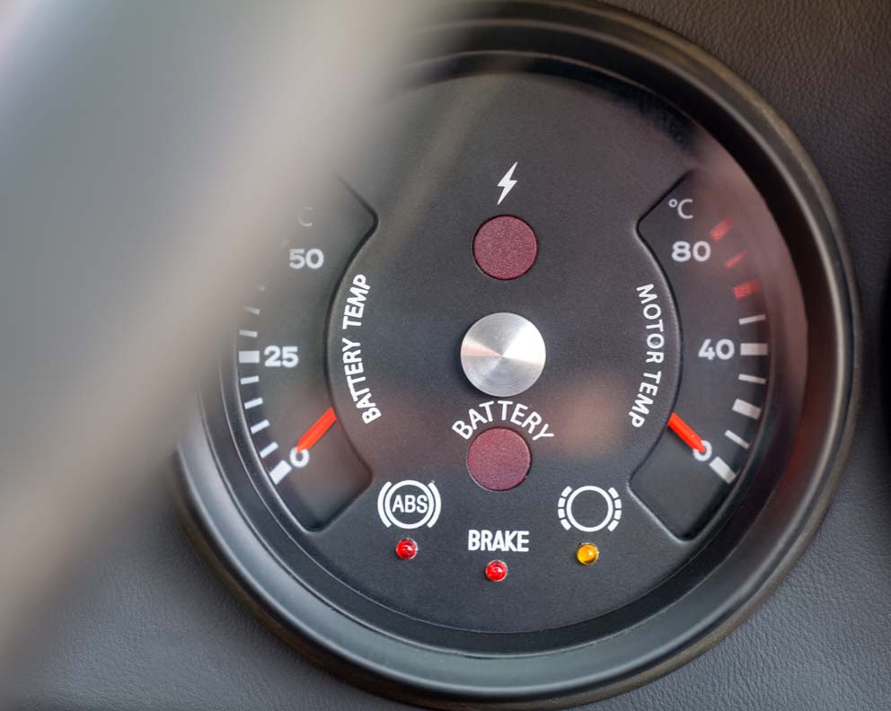 Numerous further highlights of the interior include the installation of a custom-designed heating and air conditioning system. In addition, a modern Porsche Classic Communications Management with full touch screen navigation, DAB+,  Bluetooth®, Apple Car Play™is added. All of the car’s traditional gauges are replaced with Porsche-inspired EV gauges, and as with the internal combustion engine and transmission components, the original gauges can be retained for the customer on request.