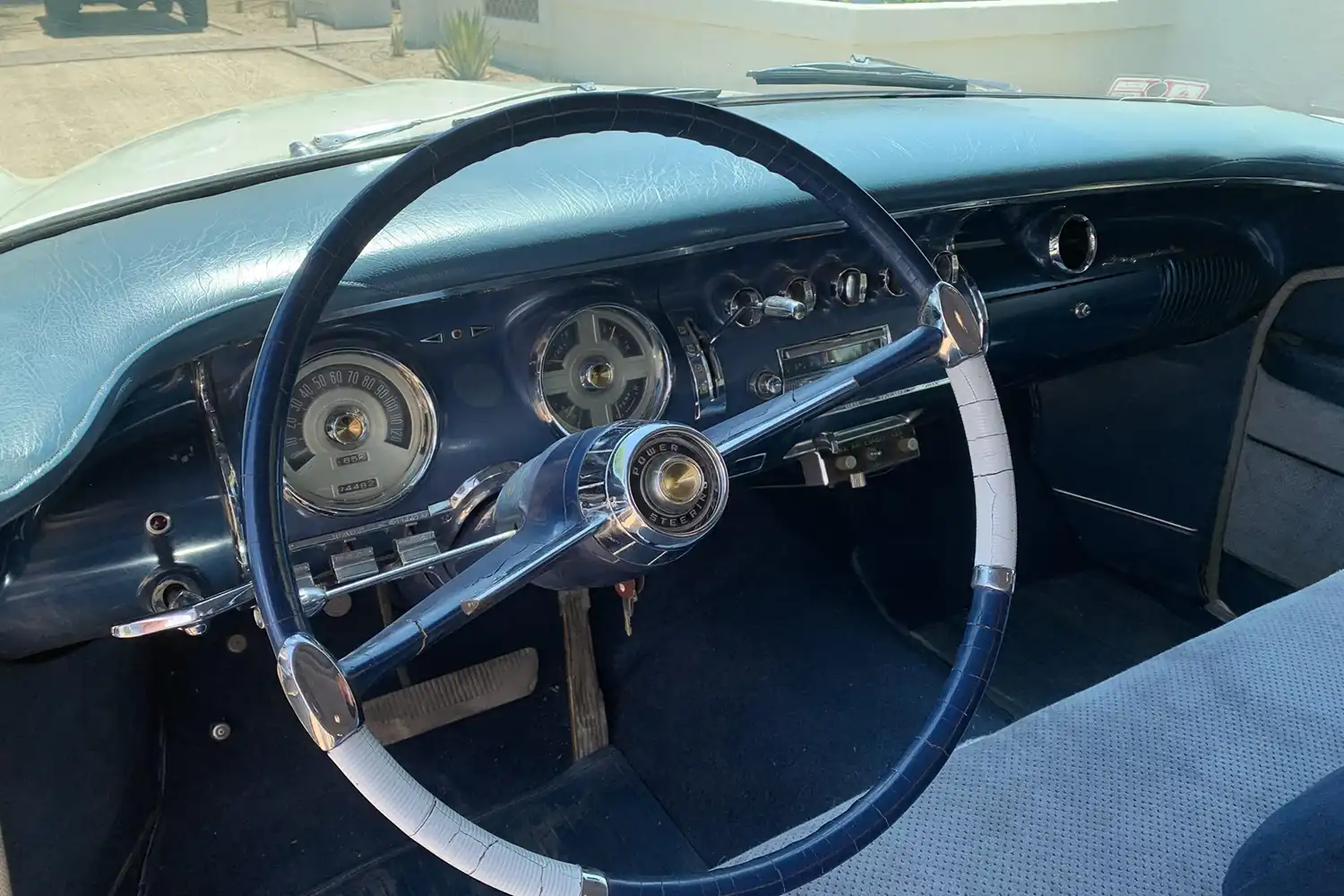 Comfort-Oriented Interior: The interior of this Imperial features front and rear bench seats upholstered in a two-tone blue cloth, creating a stylish and comfortable cabin. The door panels are color-coordinated, and dark blue carpets complete the interior aesthetic. Numerous power-operated features were standard on the Imperial, including power windows and a power-adjustable front bench seat, enhancing passenger convenience. Additional amenities include an AM radio for entertainment, fold-down armrests for added comfort, lap belts for safety, and rear door-mounted cigar lighters, a common feature in luxury cars of the time. The dash clock is currently missing, and the air conditioner compressor has been removed. The seller also mentions that the heater core has been bypassed due to a leak. A two-spoke steering wheel sits in front of a 120-mph speedometer and an auxiliary gauge cluster. The shift lever is located on the dashboard to the right of the gauges, a characteristic of many 1950s American automobiles. The five-digit odometer shows 74k miles, and the seller believes that it has rolled over once, indicating a total of approximately 174,000 miles.