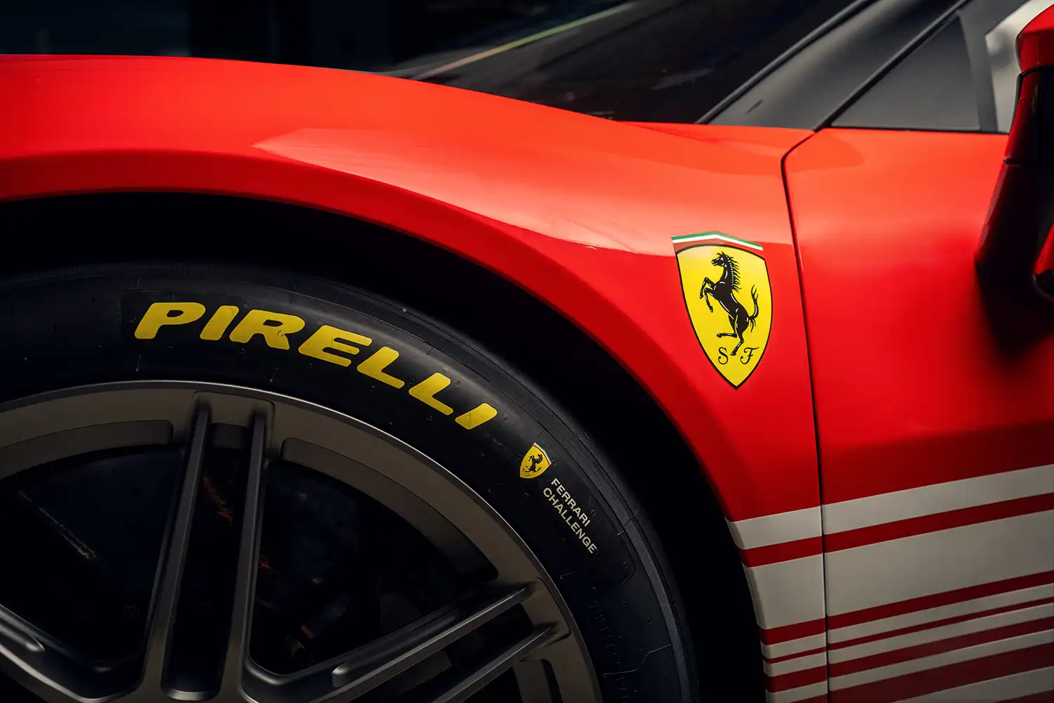 The Ferrari 296 Challenge is equipped with new Pirelli tyres, with a design phase that involved the use of advanced simulation technologies and almost a year of development, including a variety of different verification loops on international circuits. The use of a wider front wheel with an 11″ channel allowed Pirelli to develop a tyre geared towards better turn-in grip, lower wear and greater consistency over the course of a race.