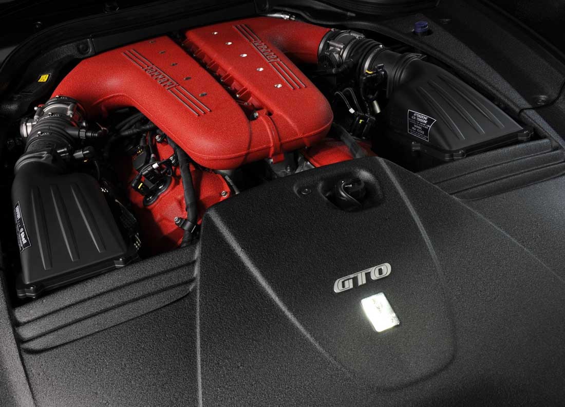 The Ferrari 599 GTO’s engine is directly derived from the 599XX unit implementing, however, the necessary modifications for road-going homologation. It thus complies with Euro 5 and LEV 2 standards. The 5999 cc 65-degree V12 engine punches out 670 CV at 8250 rpm with maximum torque of 620 Nm at 6500 rpm and there is a smooth, constant rush of power all the way to the redline with no loss of flexibility even at medium and low revs. This result was obtained by working on the fluid-dynamics and components to reduce internal friction and by adopting, amongst other things, the 599XX’s redesigned crankshaft. The car also has a racing-type intake system with a new manifold with diffuser-type intake geometry and short inlet tracts designed to improve power delivery at high revs and reduce losses. To maximise volumetric efficiency per cylinder, a connection between the two plenums at the front compensates for variations in the volume. This is how the engineers managed to achieve maximum performance at high engine speeds. The engine sound inside the car is carefully controlled to balance the intake sound with the exhaust, which features a 599XX-derived 6-into-1 manifold.