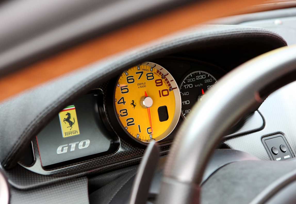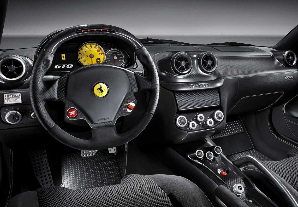 The car-driver interface was designed to maximise car and driver performance with a layout of the main commands that ensures absolute efficiency and minimum distraction. The Racing manettino also puts the emphasis firmly on sporty, track-specific driving settings by offering the driver full choice with regard to the electronic control parameters. The ICE position on the Ferrari 599 GTB Fiorano has been replaced by CT-Off (traction control off). The GTO is also fitted with bespoke, longer carbon-fibre F1 paddles for easier use in high-speed driving. In addition the GTO also features the Virtual Race Engineer, a system that monitors the status of the car and gives the driver immediate visibility of vehicle performance.