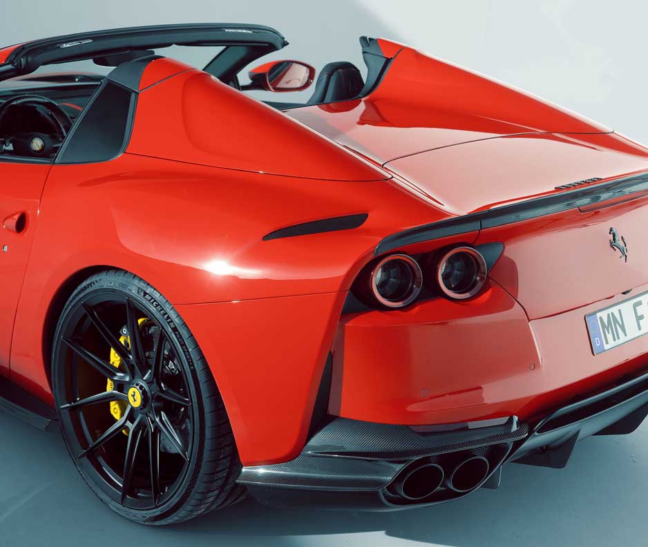 The carbon trim for the exterior mirrors and the trim for the side air outlets behind the front wheel arches round off the modified side view. The two air outlets on the hood round off the racing looks. The forged wheels developed specifically for the 812 models in cooperation with Vossen play of course also a crucial part in the thrilling looks of the Ferrari refined by NOVITEC. To emphasize the wedge shape of the open-top two-seater further, three tailor-made wheel/tire combinations with staggered diameters were developed for the front and rear axle. All NOVITEC forged wheels are available in a variety of colors and with three different surface finishes – standard, polished or brushed.