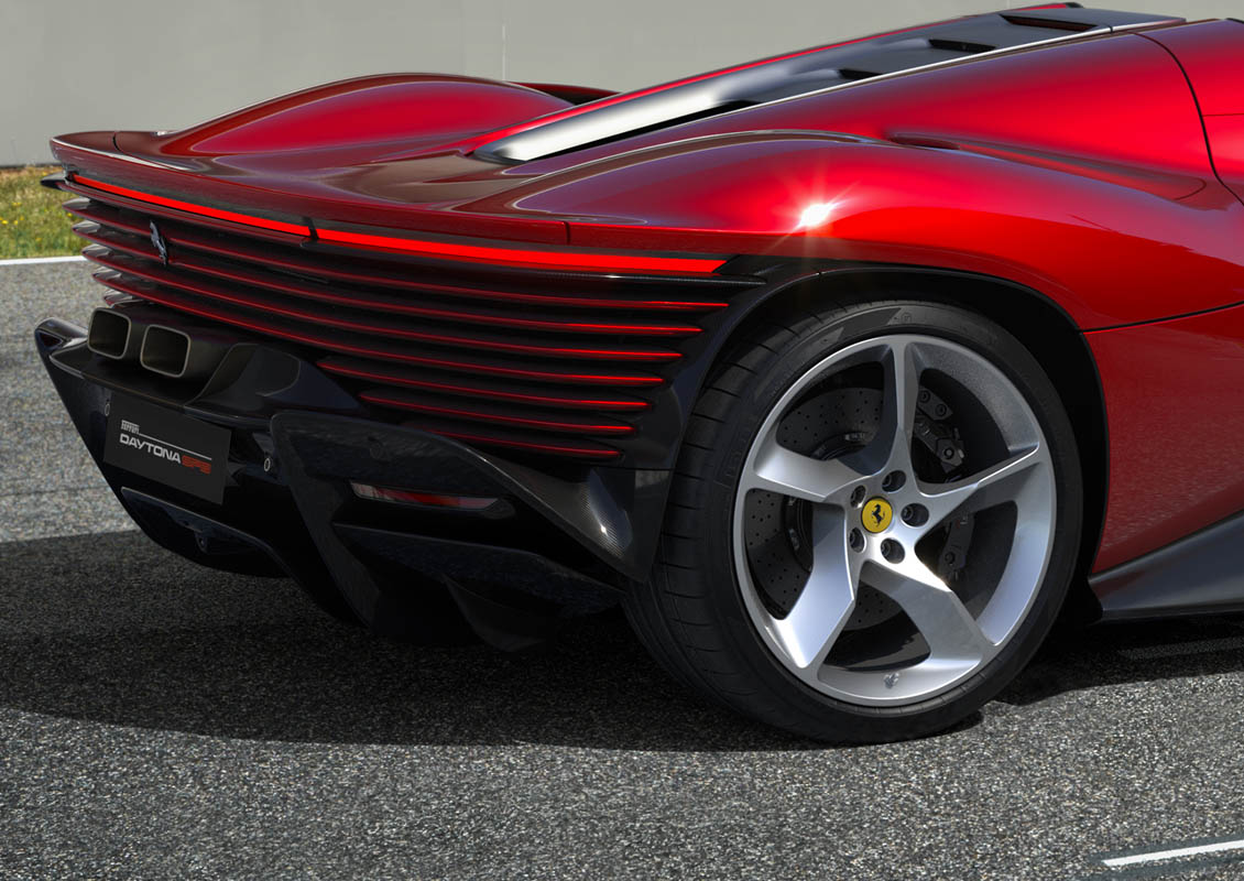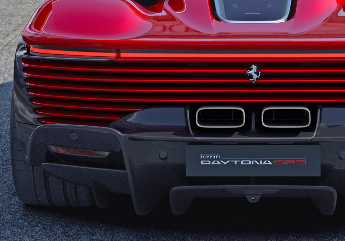 A series of horizontal blades complete the rear, creating the impression of a light, radical, structured monolithic volume that lends the Daytona SP3 a look that is both futuristic and a nod to signatures from Ferrari’s DNA. The taillight assemblies are made up of a horizontal luminous bar beneath the spoiler and integrated into the first line of blades. The twin tailpipes are positioned centrally in the upper part of the diffuser, adding to its aggressive character and completing a design that visually broadens the car.