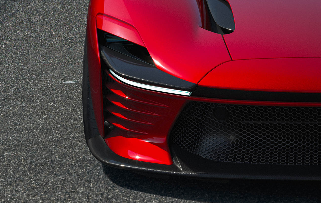 The front of the Daytona SP3 is dominated by two imposing wings that feature outer and inner crests: the latter dive into two air vents on the bonnet, making the wings look wider. The relationship between the perceived mass created by the outer crest and the aerodynamic role of the inner one underscores the way in which styling and technology are inextricably linked in this car. The front bumper has a generous central grille framed by two pillars and a series of stacked horizontal blades framed by the outer edge of the bumper. The headlight assemblies are characterised by an upper mobile panel that recalls the pop-up headlights of early supercars, a theme dear to Ferrari tradition that lends the car an aggressive, minimalist look. Two bumperettes, a reference to the aeroflicks featured on the 330 P4 and other sports prototypes, emerge from the outer edge of the headlights, adding a further expressiveness to the front of the car.