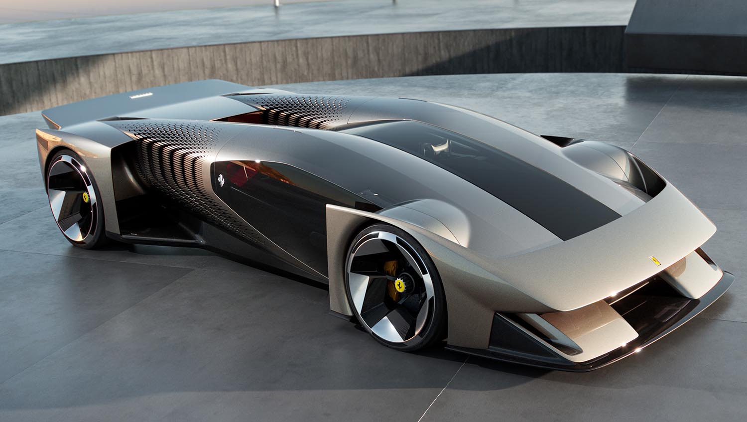 Floating splitters, ramps, and retractable headlights reference Ferrari tradition while emphasising futuristic performance. The upper wing integrates the taillights and central channel as a portal to new design philosophy.
