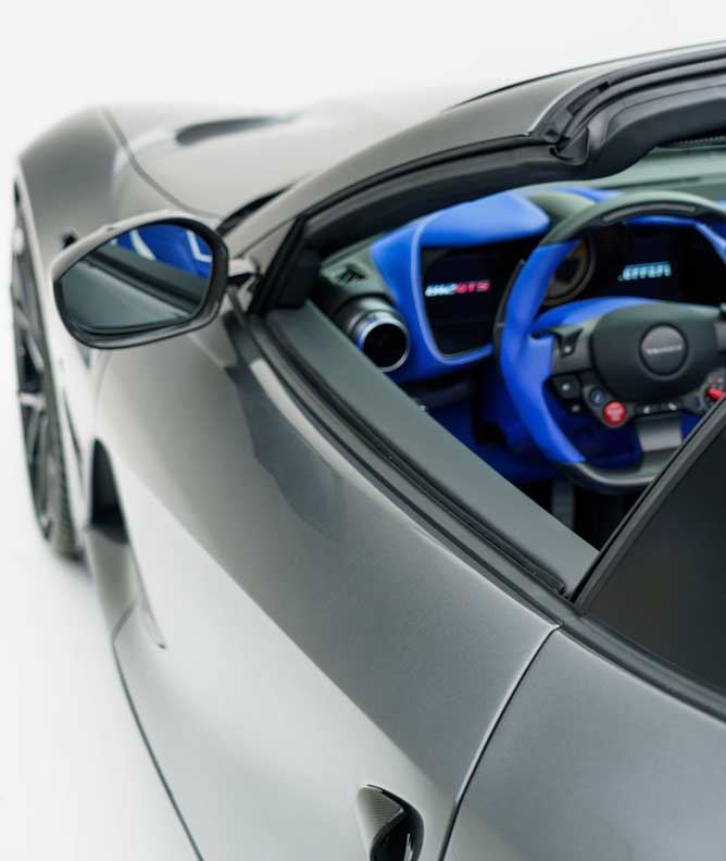 Almost all components of the interior have been upholstered in blue leather by master craftsmen and in some cases additionally accentuated with carbon. Countless white applications are used in the interior. Precisely embroidered logos and illuminated door sill panels elegantly round off the all-encompassing interior refinement.