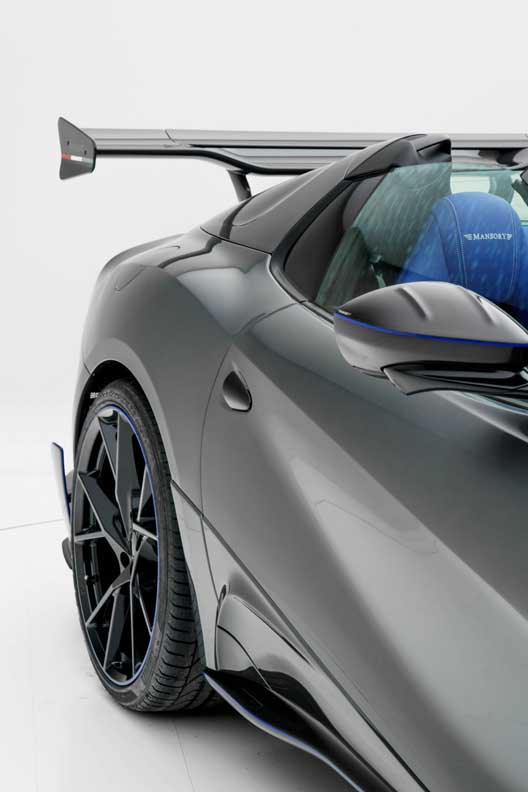 Whether front apron, side skirts, rear apron with diffuser or the striking rear trim – all components finished in carbon fibre integrate perfectly and very harmoniously into the Italian series design thanks to the precise MANSORY craftsmanship.