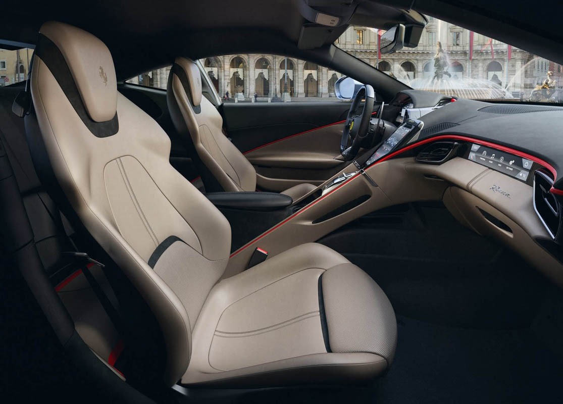 Unlike the Prancing Horse’s sports cars, which are typically more driver-oriented, the Ferrari Roma’s cabin has an almost symmetrical structure which produces a more organic distribution of both spaces and functional elements. In fact, the passenger will feel very involved in the driving experience, almost like a co-pilot. In line with this integrated architecture approach, forms have been crafted to create a sculptural volume in which there is a sense of textural continuity between all the various cabin elements. Created by paring back the volumes and underscored by piping along their edges, the two cockpits are cocooned in a wraparound volume and extend from the dashboard all the way back to the rear seats, organically incorporating the dash, doors, rear bench and tunnel.