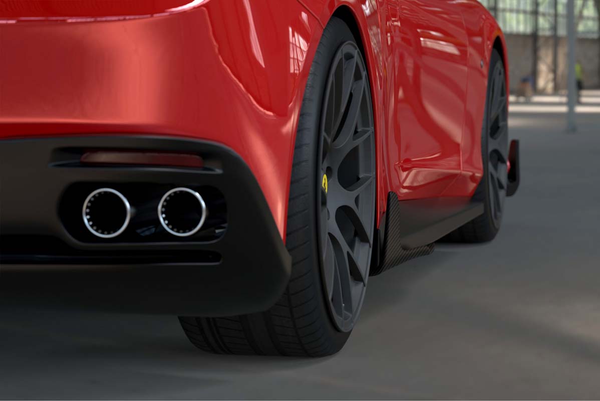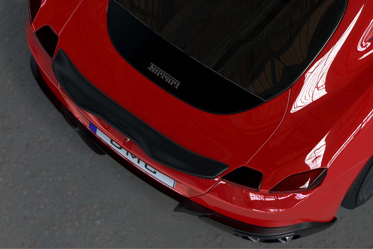 The DMC front lip installs by attaching it to the production bumper. It adds needed downforce and and gives the Roma an aggressive front fascia. Downforce is well needed since the new engine spec is so powerful that the car needs an optimized stability at high speeds. The DMC side skirts attach directly to the stock side rocker panels and give the Ferrari a lower and sleeker visual stance in the side view and optimize the airflow between the front and rear wheel arches. In order to improve the rear up-lift, and thus achieve an optimal aerodynamic balance, DMC enhanced the Roma with a lip spoiler on the rear trunk lid. Further upgrades are the rear diffuser insert, all which reduce rear-axle lift.