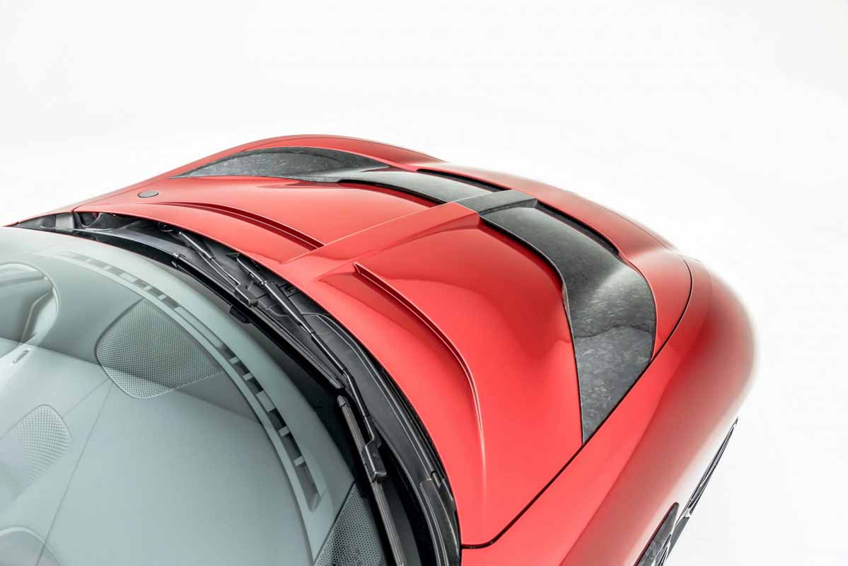 The full carbon bonnet for the “Roma” is available in two design variants. The customer can thus opt for a bonnet that shows its carbon structure either in sections or completely visible.