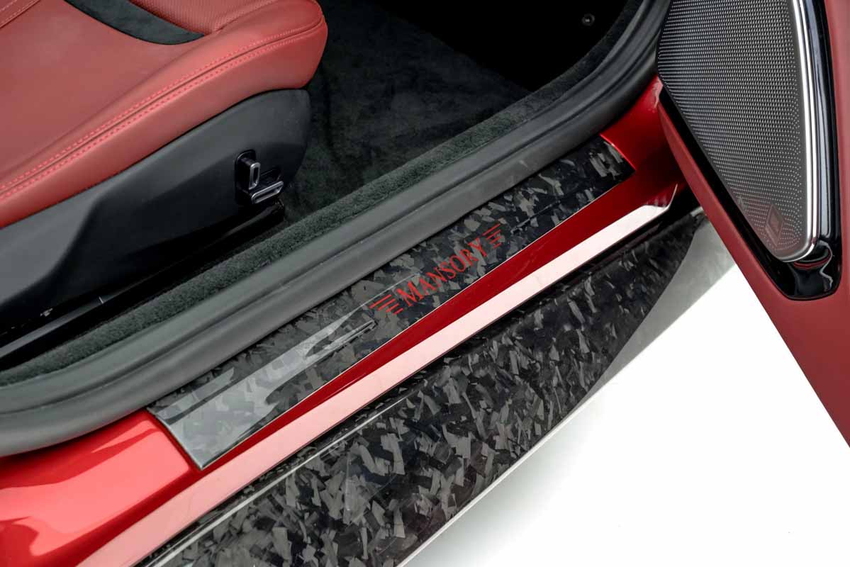 In the interior, MANSORY creates a sport-oriented atmosphere that perfectly combines functionality and comfort. The newly designed sports steering wheel as well as the aluminium pedal gallery guarantee full control of the vehicle at all times and at the same time appeal to the technology-savvy driver with a sense of style. At the same time, the interior, which is completely done in leather, fulfills the luxury standard that applies to all MANSORY complete conversions at the very highest level. Precisely embroidered logos and illuminated door sill panels elegantly round off the fully comprehensive interior refinement.