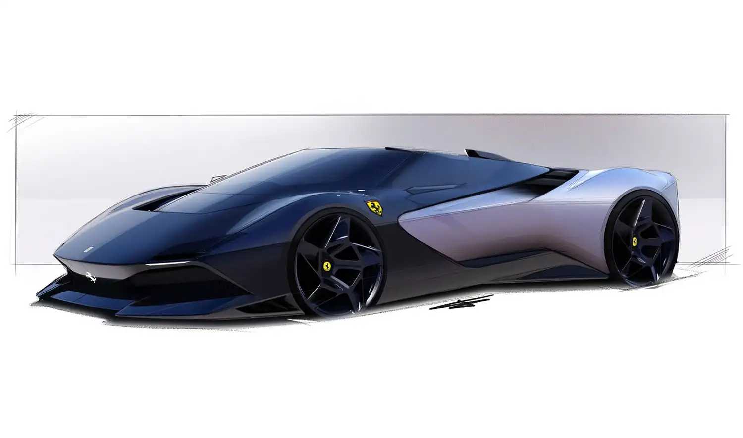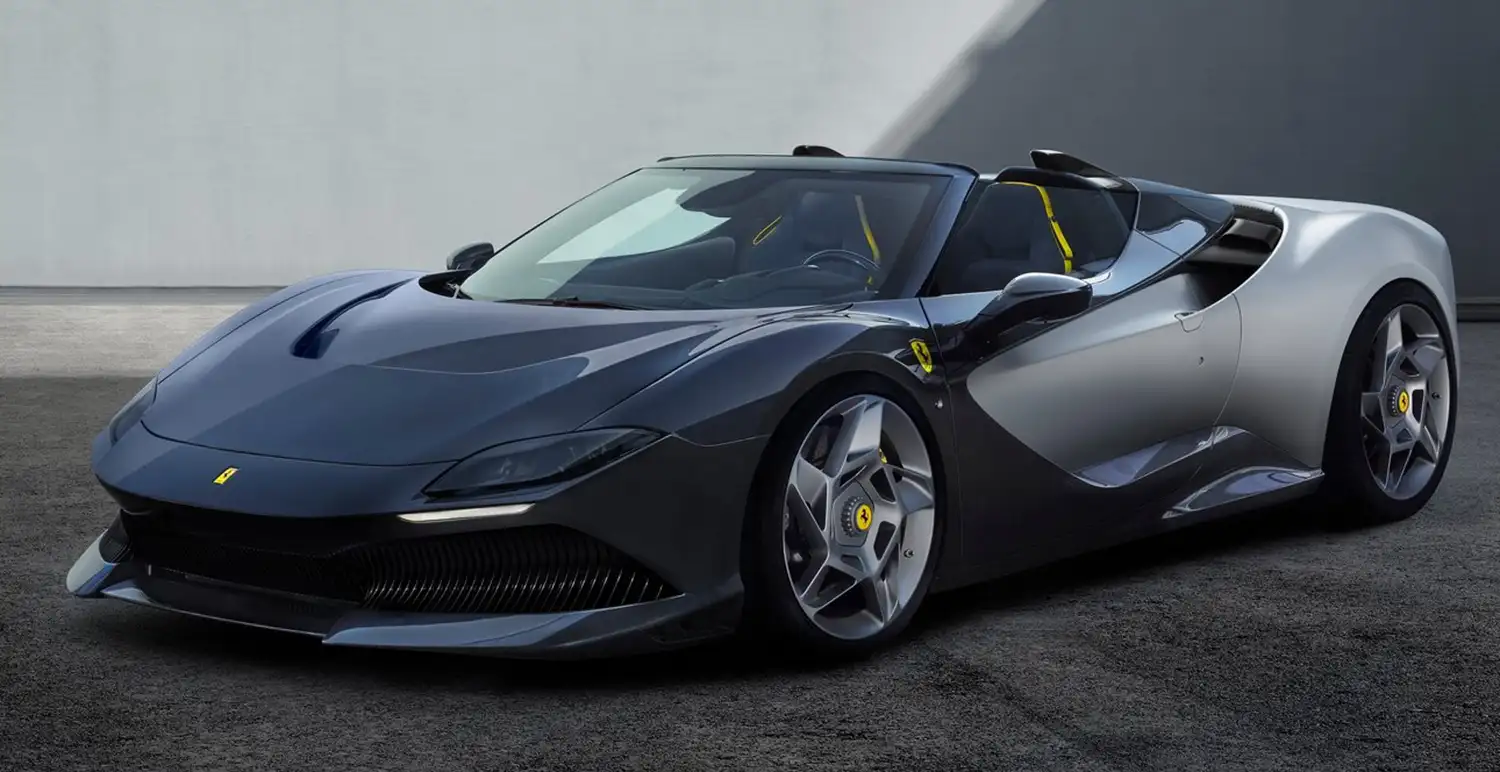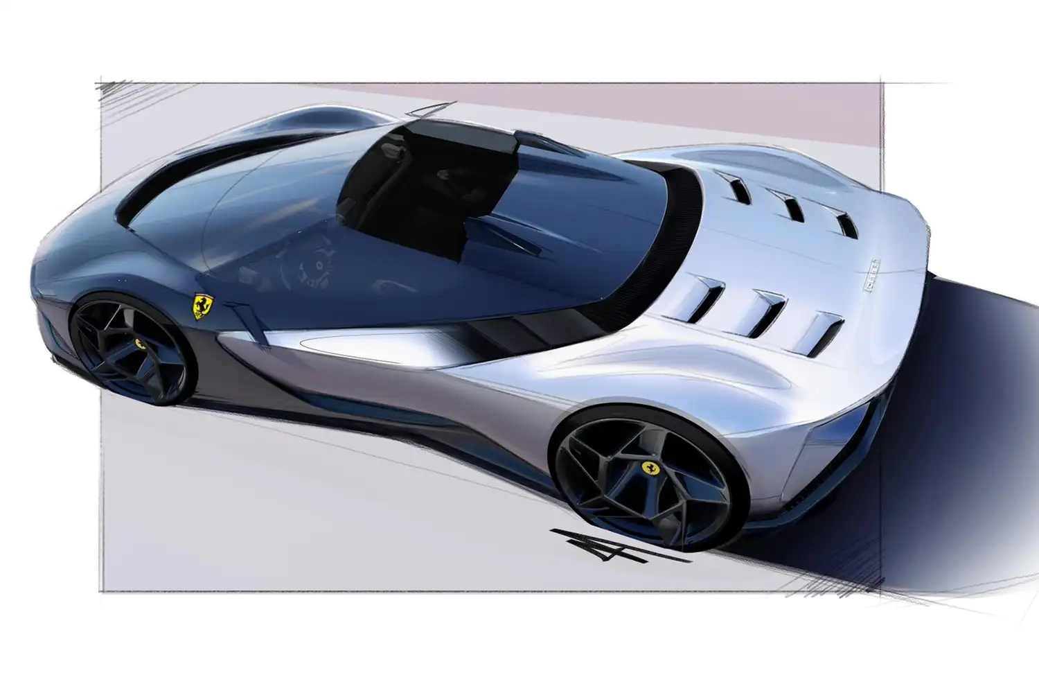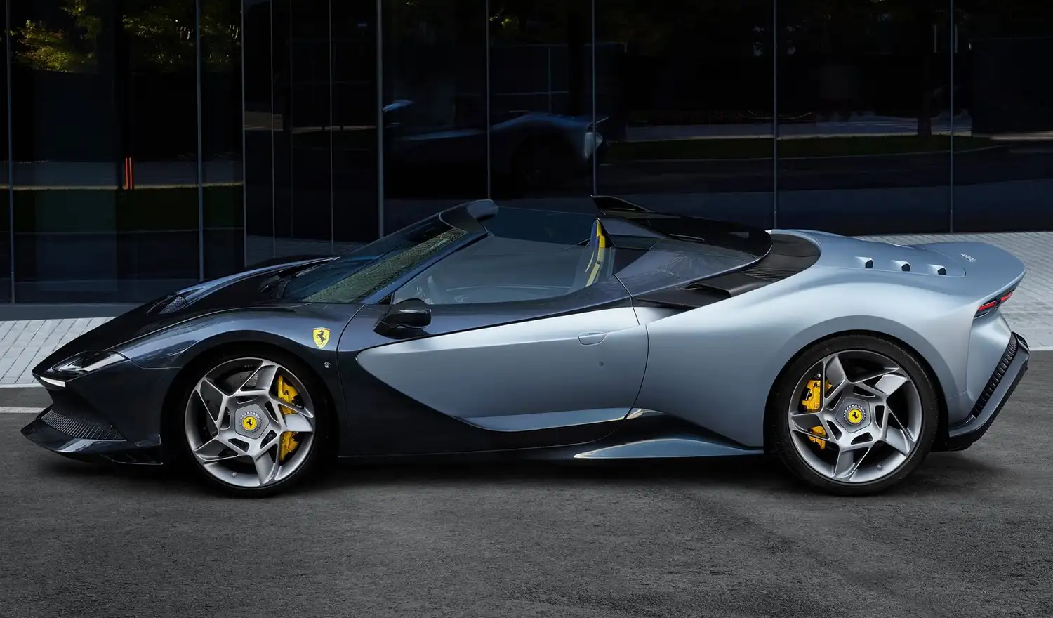 Inside the car, an important modification has been made to the central console to house the F1 gearbox commands that have featured in the Ferrari range since the debut of the SF90 Stradale. This meant modifying the now iconic shift-gate for this specific application. The interior finish is completed with seats featuring details in laser-etched Navy Blue Alcantara® coupled with gradient effect cloth, and carpets in specific twill fabric with an iridescent effect.