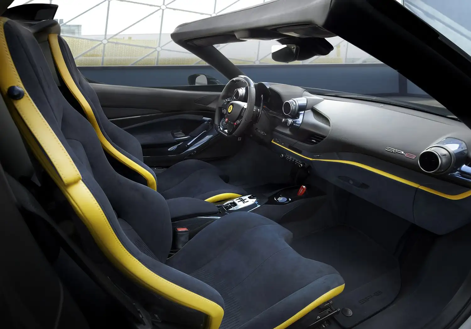The car’s main styling theme centres around the way in which its volumes crossover and fuse into one another: the unpainted carbon-fibre front wraps around to the tail, creating a two-tone effect that creates a powerful contrast in terms of both colour and materials. The elimination of the retractable hard top allowed the designers to radically restyle the entire tail section, giving it a full volume with a taut belt line. The car’s volume is divided into two parts which are connected by a functional central area in matte black that includes the side air intakes with separate ducts for the intercoolers and engine. The upper section of this band incorporates a vent for the engine compartment with longitudinal elements that reference the lateral strakes typical of Ferraris of the past.