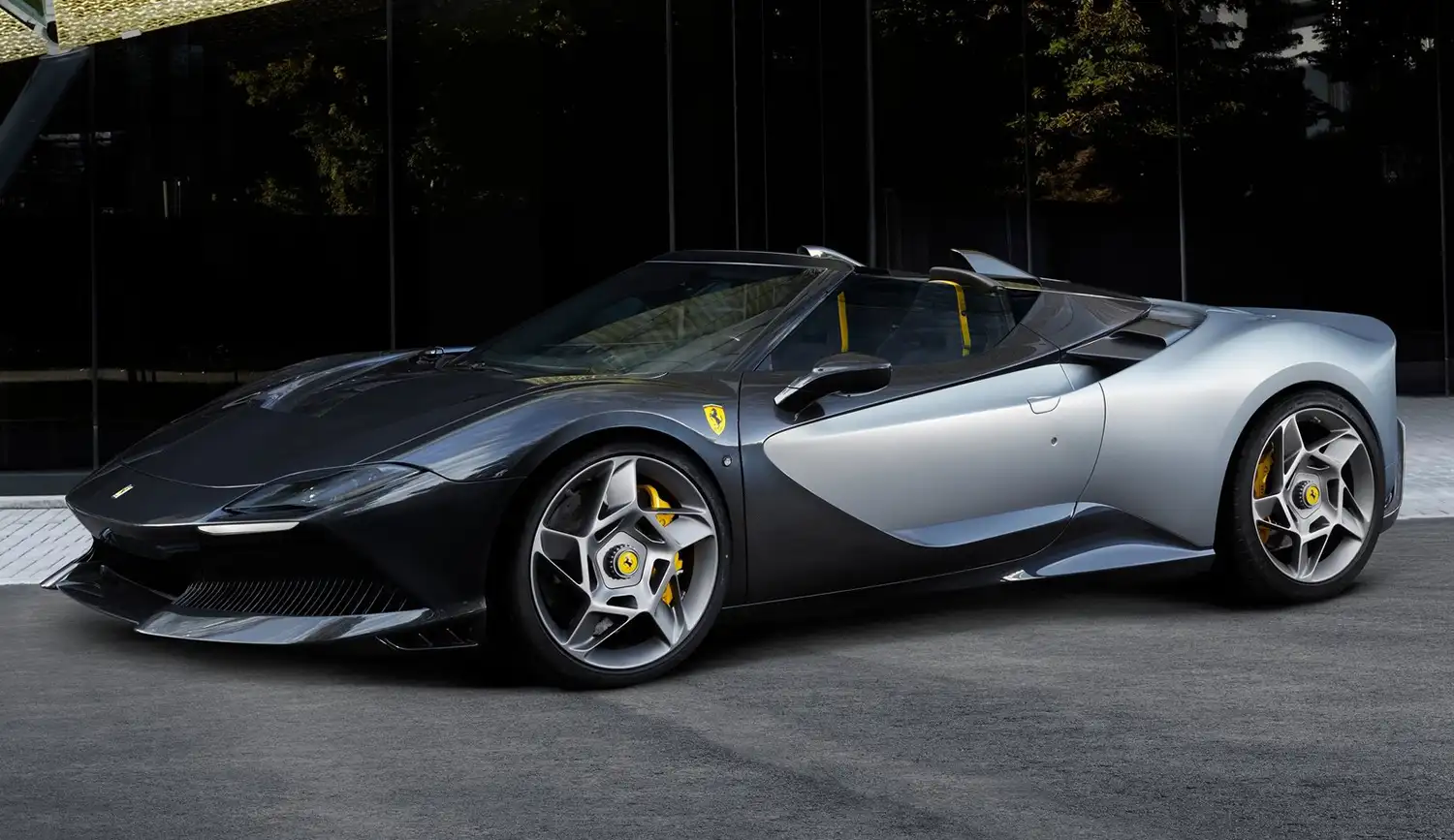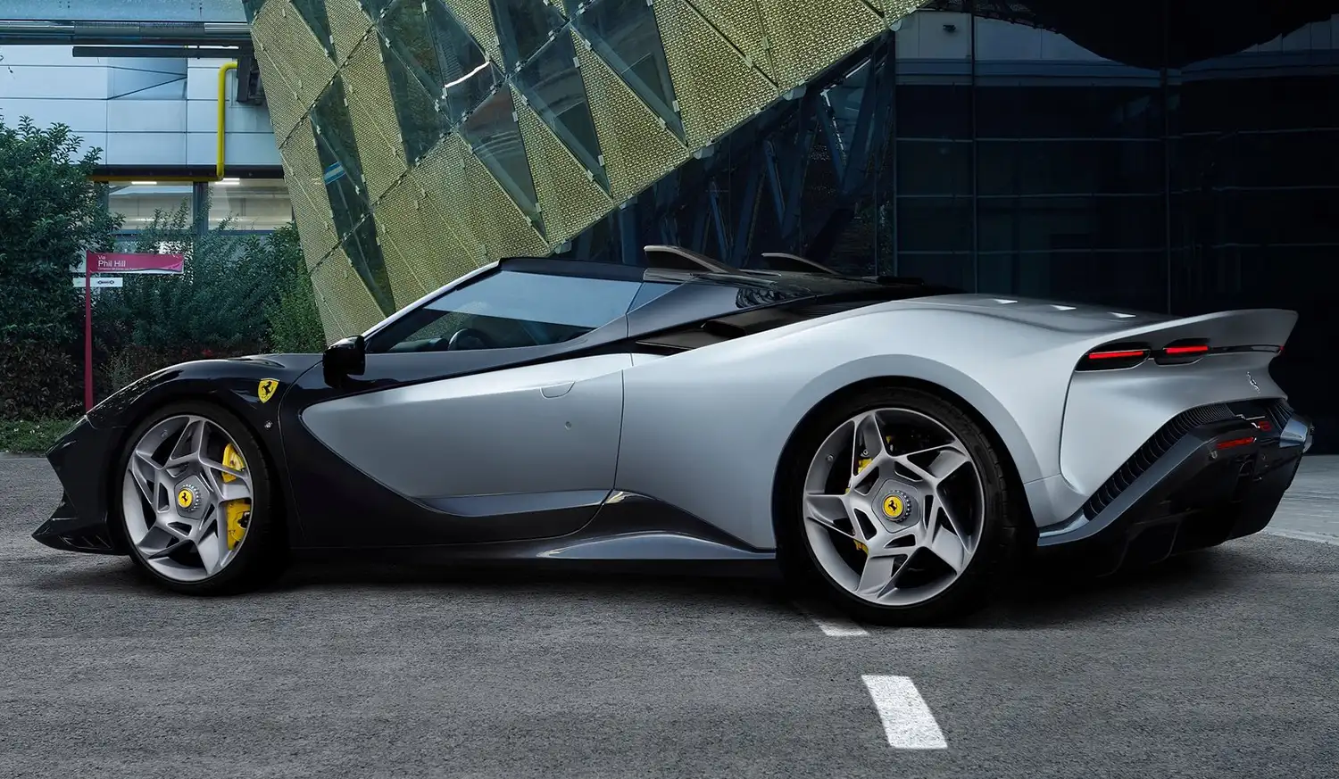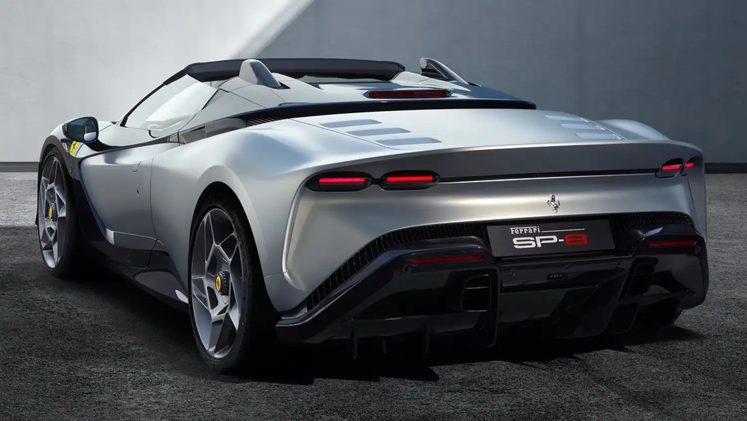 Other areas of the Ferrari SP-8 that were redesigned from the donor car include the headlights, which have special masks and lenses, the rear lights derived from those of the Roma with specific lenses, the windscreen, the tailpipes, which were given the same treatment as the 296 GTB’s, and the specially-designed wheel rims in a dedicated colour (matte Grigio NART).