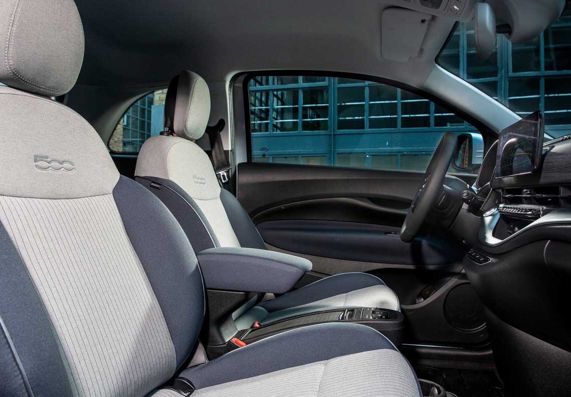 The elegant fabric seats with Seaqual yarn and pinstripe motif can be chosen in a choice of dark grey, with the 500 logo and copper-coloured details, or a light grey version paired with blue flecks and silver 500 logo and details.