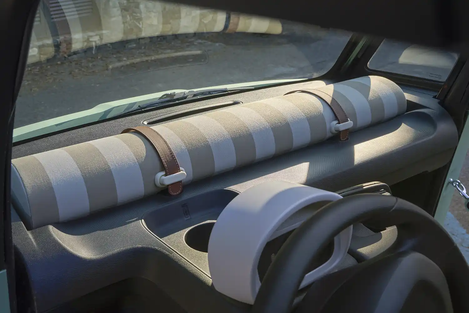 The closed version can be customized with wooden effect stickers on the doors, while in the open version the stickers – with stripes as a summer tent – can be added to the roof giving an extra touch of Dolce Vita. Both versions are equipped with the Rear Carriage, the Dolcevita Box, which is an elegant and functional band of fabric inside which personal items can be stored, and vintage chrome effect mirrors. What differentiates them is the addition of both the Dolcevita Door Sills and Door Rope in the open version, and the Roof Sunblind in the closed one.