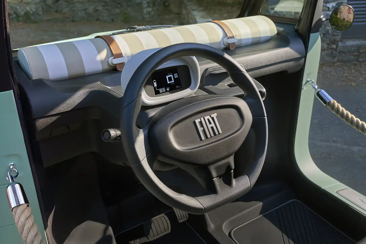 With truly unique accessories – such as the little shower, which makes it the perfect beach essential – a fresh design, and the ability to drive it from age 14 and up, the New Fiat Topolino also embraces a new target audience.