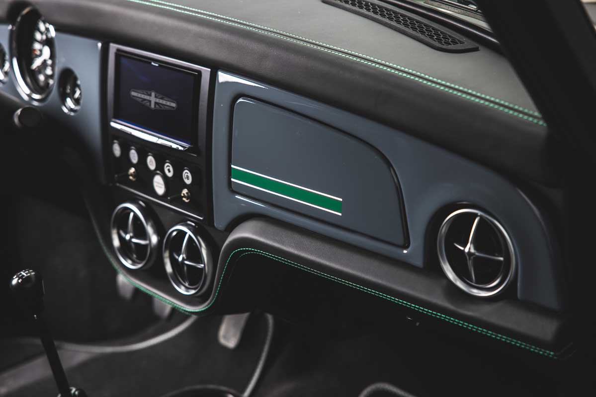 The model delivered to Scandinavia has a 4-seater configuration and comes with bespoke Carbon Grey with Heritage Green accents throughout, a special number-delete on the grille, rear and interior and 13″ alloy wheels, finished in Graphite.