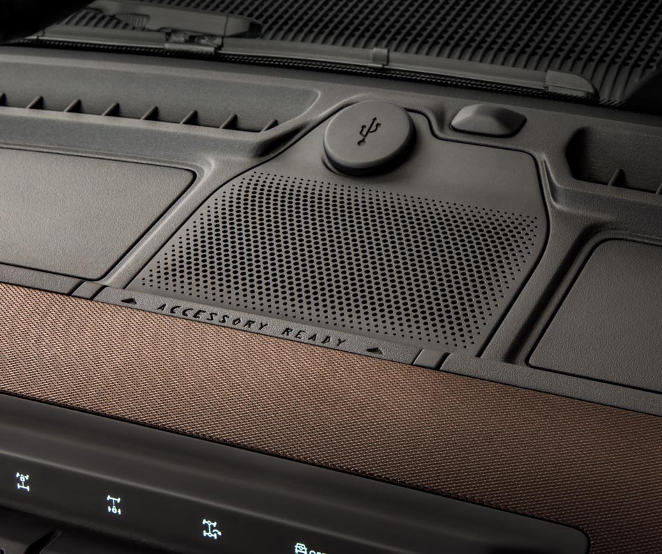 The instrument panel (IP) in the Bronco is tailored for adventure-seeking owners. Inspired by the straightforward design of the original Bronco, the IP features an available switch panel within easy reach along the top of the dashboard for functions such as locking front and rear differentials. The touchpoints have a rubberized lining to make them easier to wipe clean. Attachment points are built into the upper instrument panel to mount a camera or other device with 12‑volt power connections ready to use. Available grab handles are integrated into the modular IP and centre console.