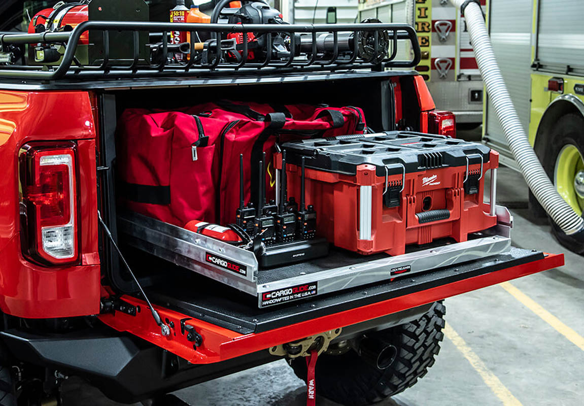 Equipped with the right gear to get the job done, Fire Command is ready for action thanks to suspension upgrades with oversized wheels and tires, dual winches, state-of-the-art comms, emergency lighting, first aid, an assortment of tools, storage, and much much more. Given BDS’s reputation and background, it’s no surprise this Bronco is outfitted with the latest and greatest BDS and FOX components. Along with the half cab conversion, the “bed” has been fitted with a custom bottom-hinged drop tailgate in place of the swing gate that gains access to a slide-out storage tray. If you missed how Project Fire Command took shape, be sure to check back through the entire build series to see how this Bronco came to be.