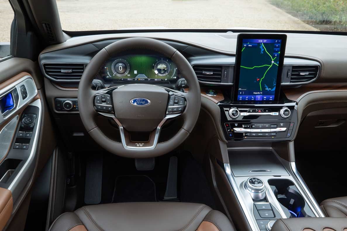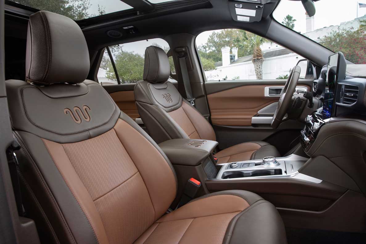 Outside, Explorer King Ranch comes decked out with a unique Stone Gray-painted mesh grille insert, 20-inch aluminum wheels with Running W center cap, liftgate scuff plate and quad chrome exhaust tips. Capping it all off is signature King Ranch badging.