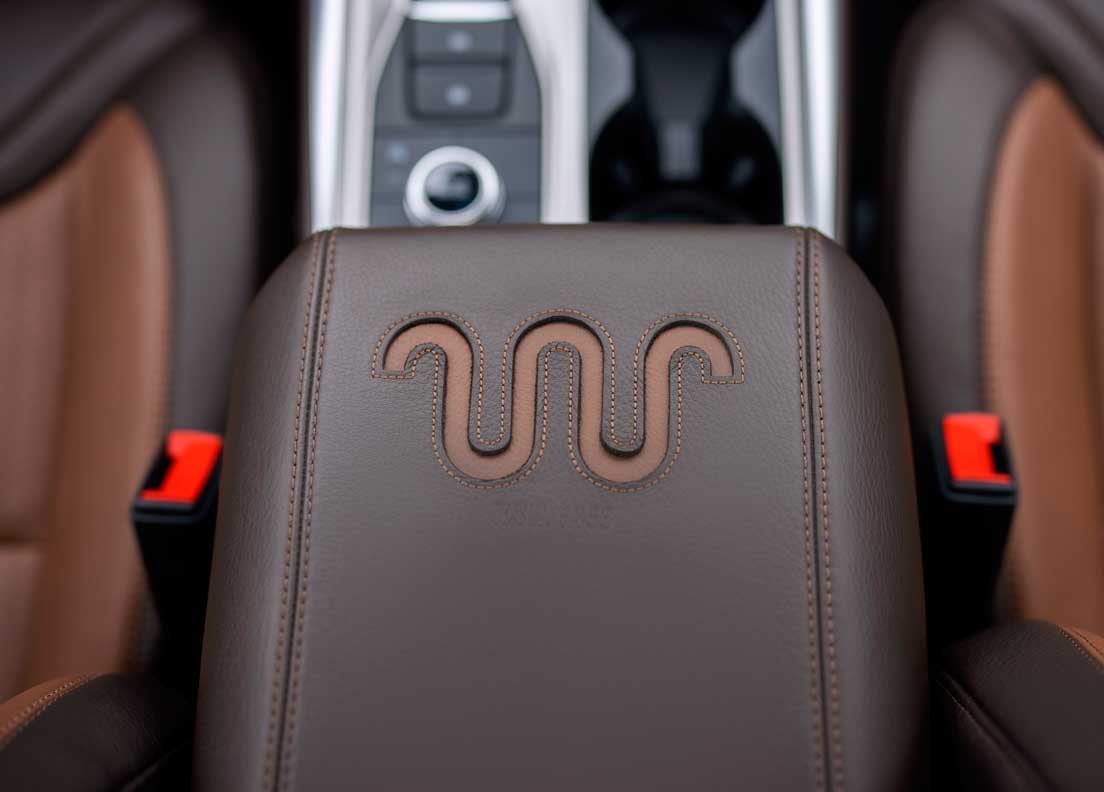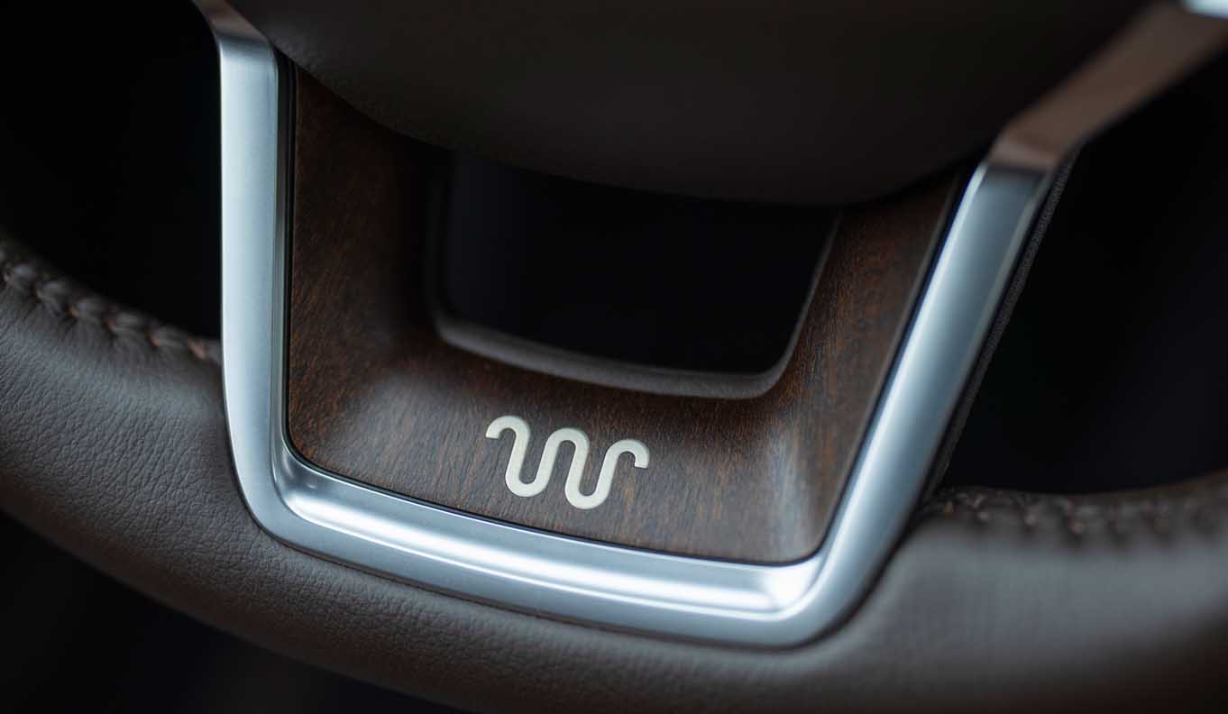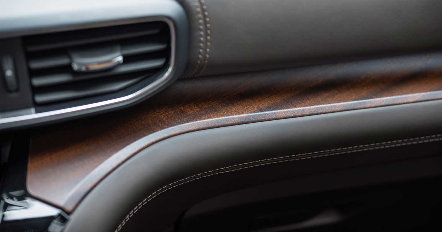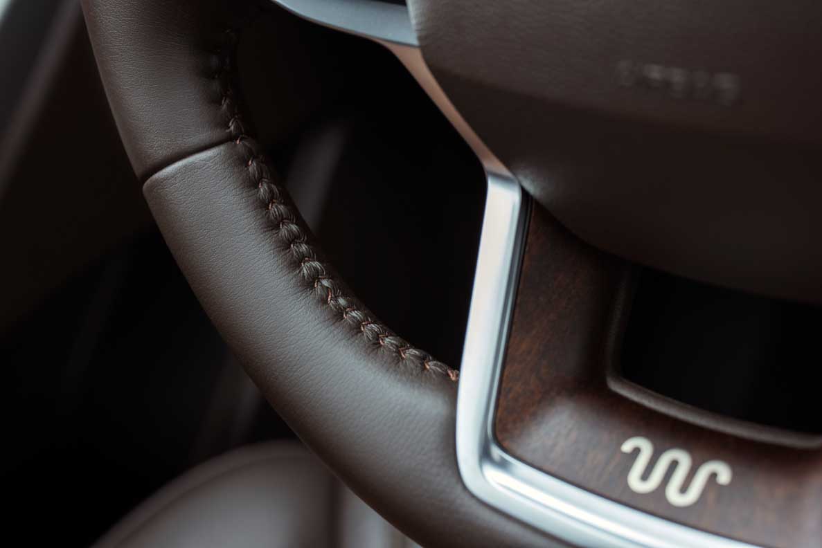 The refinement continues in the cockpit with leather door trim rollovers, a leather-wrapped and stitched instrument panel combined with Sapele wood appliqués as well as a leather-wrapped steering wheel with Norias stitching and a Sapele wood insert.