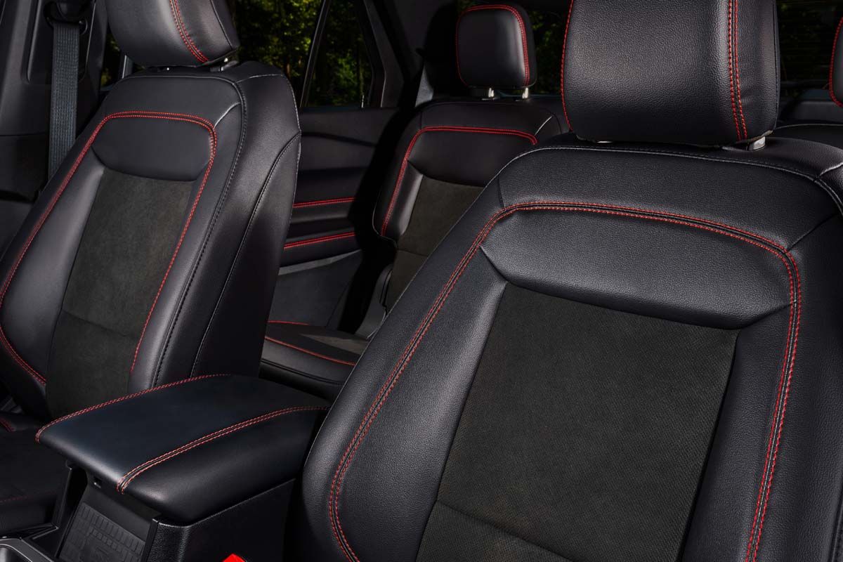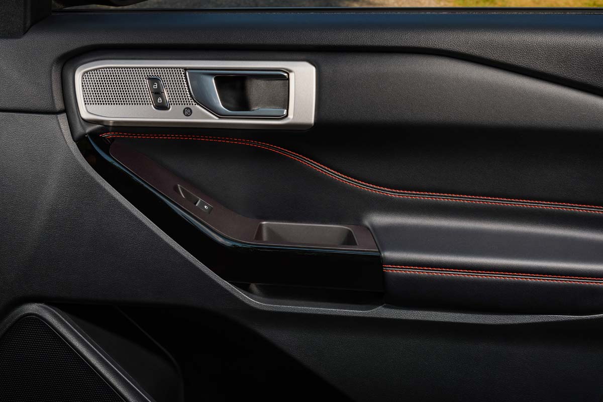 The interior is designed to provide the feel of performance while surrounding the customer with the latest technologies. Explorer ST-Line customers will find Ebony Black ActiveX-trimmed seats with Miko inserts, heated first-row seats, heated sport-style steering wheel and red accent stitching throughout. Available premium technology features include 12-speaker B&O® sound system, wireless charging pad, auto-dimming rearview mirror and 360-degree camera. There is also Ford Co-Pilot360 Assist+ technology†† including Evasive Steering Assist, Intelligent Adaptive Cruise Control with Stop and Go, and voice-activated navigation. Additional touches include ST-Line scuff plates and premium floor mats.