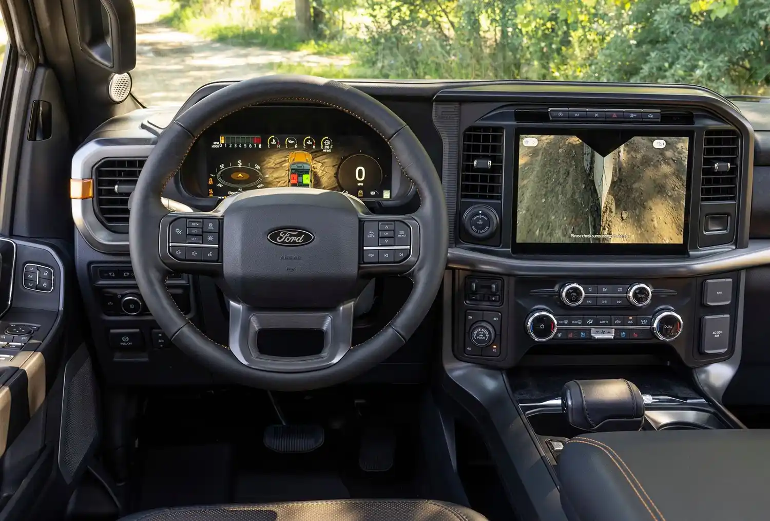 A 12-inch cluster screen features truck-specific graphics and animations that respond to the selectable drive modes and can display off-roading data and turn-by-turn navigation. New for 2024, F-150® Raptor® and F-150 series vehicles can display two views simultaneously in Tow/Haul, Off-Road, and Rock Crawl Drive Modes.