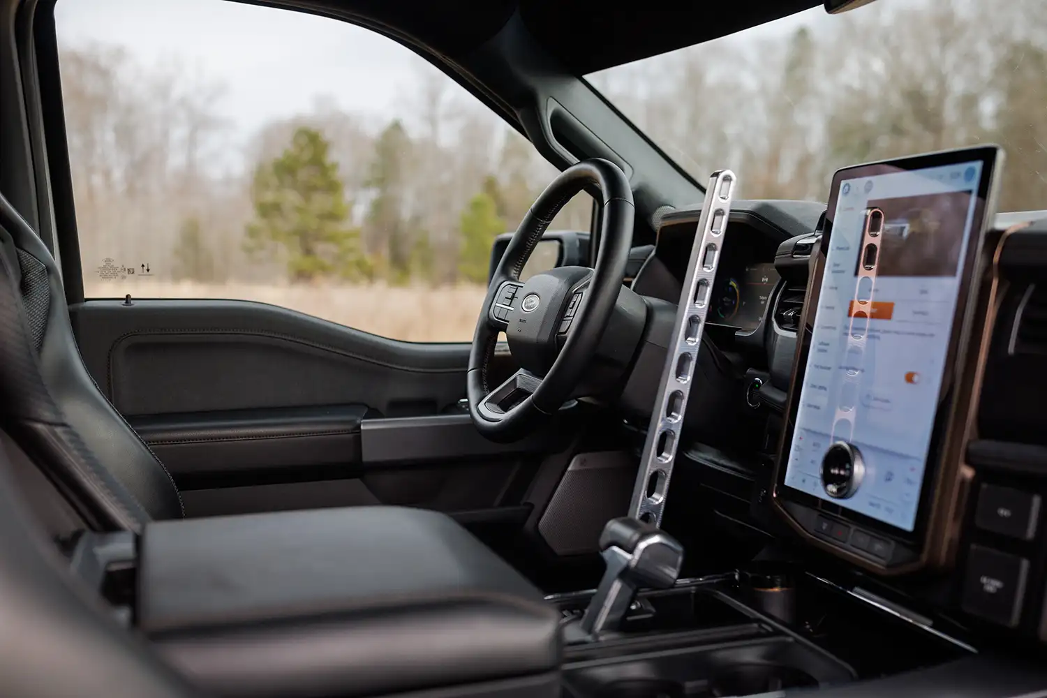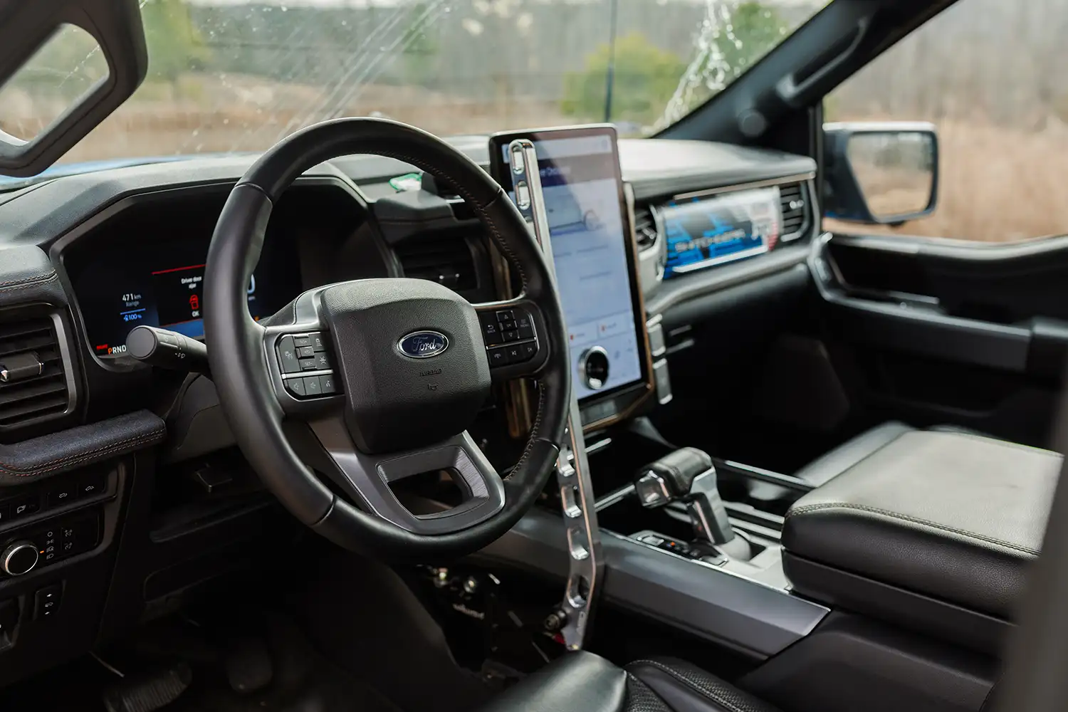 To manage rough terrain, the suspension on F-150 Lightning Switchgear – named not just for its off-road capability, but its performance on asphalt – uses FOX 3-inch diameter internal bypass shock absorbers plus unique front and rear bumpers to improve approach and departure angles.