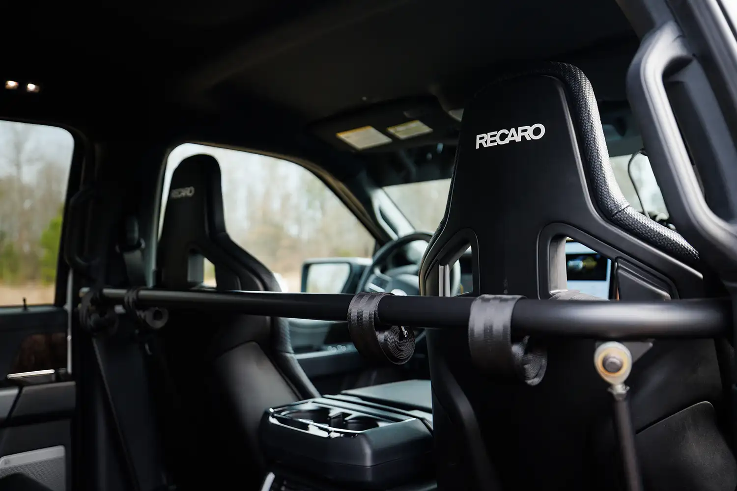 Switchgear also has carbon composite front fenders, bed sides and rear bumper cover. Steel fabricated rock rails and front skid plate are added to ensure the vehicle is prepared for rough off-road terrain. Limit straps are added to help manage suspension and wheel travel.