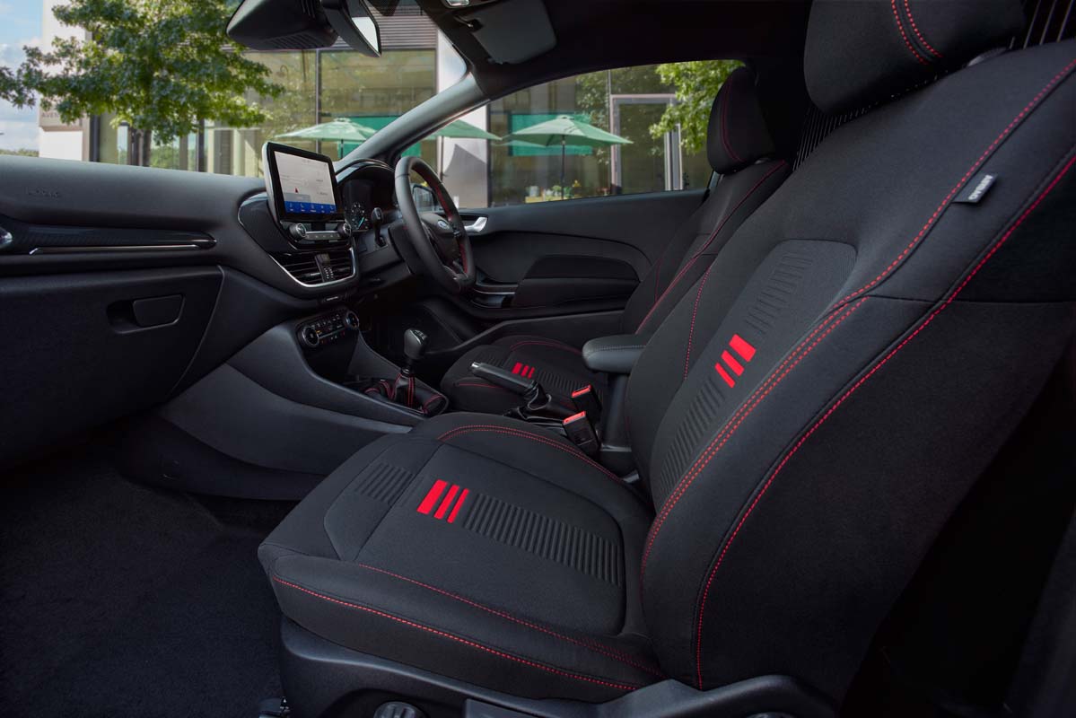 A fresh exterior design incorporates a more aggressive fascia appearance, with honeycomb upper and lower grilles alongside large lower side vents. Fiesta ST upper grille and side vents are finished in distinctive Chrystaline Grey, and the aero-optimised lower lip spoiler, side skirts, rear hatch spoiler and rear diffuser are finished in body colour. Standard 17-inch or optional 18‑inch alloy wheels feature a brooding dark Magnetite finish, and exterior colour options now include bold ST Mean Green.