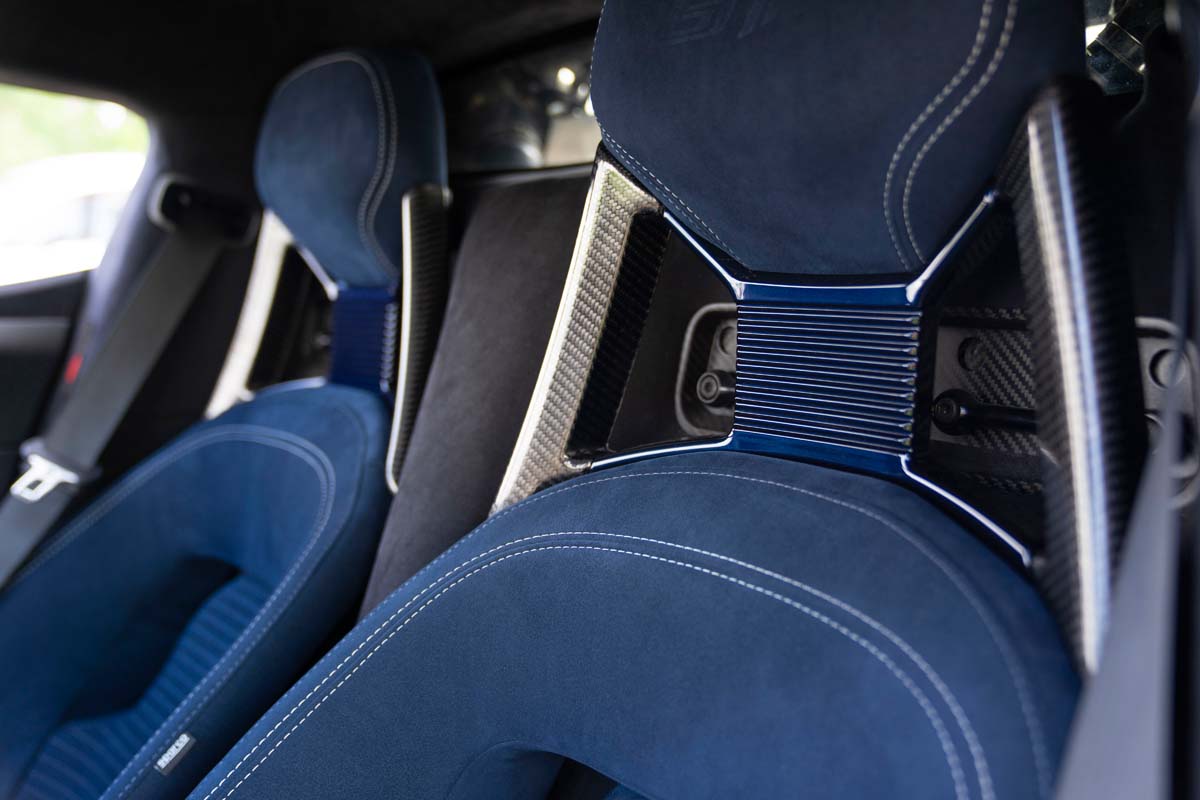 Carbon fiber carries into the cabin as well, with carbon fiber door sills, lower A-pillars and console, along with matte carbon fiber registers. Lightspeed Blue Alcantara®-wrapped carbon fiber seats feature silver stitching, while seating surfaces and head restraints are embossed with the GT logo. The instrument panel is wrapped in Ebony leather and Lightspeed Blue Alcantara, while pillars and headliner are wrapped in Ebony Alcantara. Antimatter Blue appliqués on the instrument panel, door register bezels and seat X-brace are coordinated with the unique wheels. The steering wheel is finished in Ebony Alcantara with black stitching, while dual-clutch paddle shifters are clear and polished.