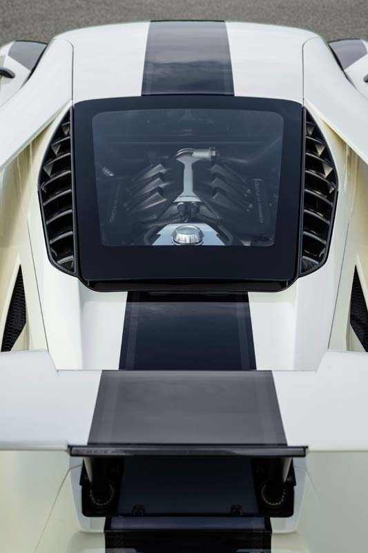 The Ford GT ’64 Prototype Heritage Edition supercar wears Wimbledon White paint with Antimatter Blue graphics, including an over-the-roof triple racing stripe. Exposed carbon fiber components are prominent, including 20-inch Antimatter Blue-painted carbon fiber wheels, a touch unique to Ford GT, as well as an exposed carbon fiber front splitter, side sills, mirror stalks, engine louvers and rear diffuser finished in gloss. Brembo® brake calipers lacquered in silver with black graphics, plus black lug nuts further modernize the aesthetic.