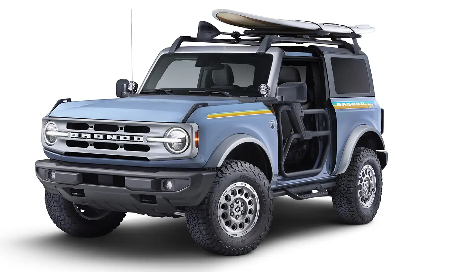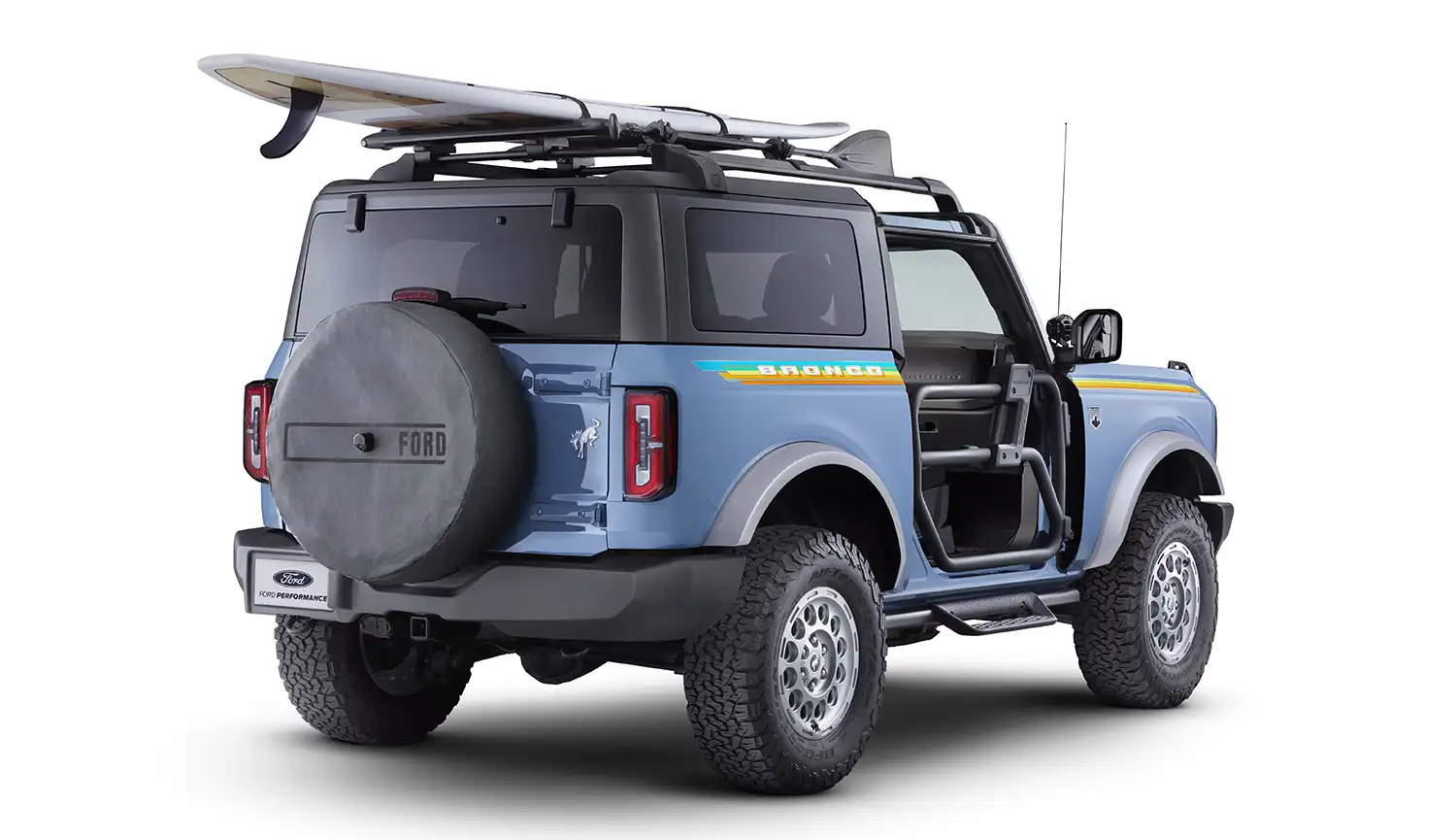 The Ford Bronco is at home in the desert, on rocky trails, or along muddy forest paths. And now it’s ready for the beach. The Ford Accessory Personalization concept package* for the Bronco balances the style-focused approach of the Blue Free Wheeling with larger mechanical changes to give customers everything they need for surf and sand. Starting with a 2.0-inch lift from a Bilstein suspension that’s been tuned to Ford Performance specifications, this package includes retro-cool graphics, an open-air Bimini roof, tube doors and painted wheel arches and grille from the Outer Banks trim represent the care-free attitude that a day at the beach demands.