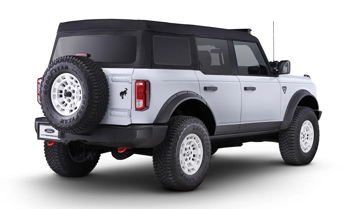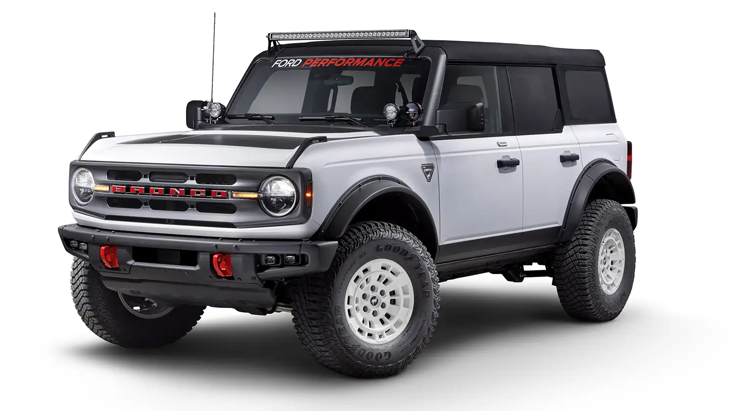The Bronco Ford Performance ORV concept package* mixes form and function and is available on any Bronco Base, Big Bend, Black Diamond, or Outer Banks with the 2.3-liter EcoBoost engine and either automatic or manual transmission.