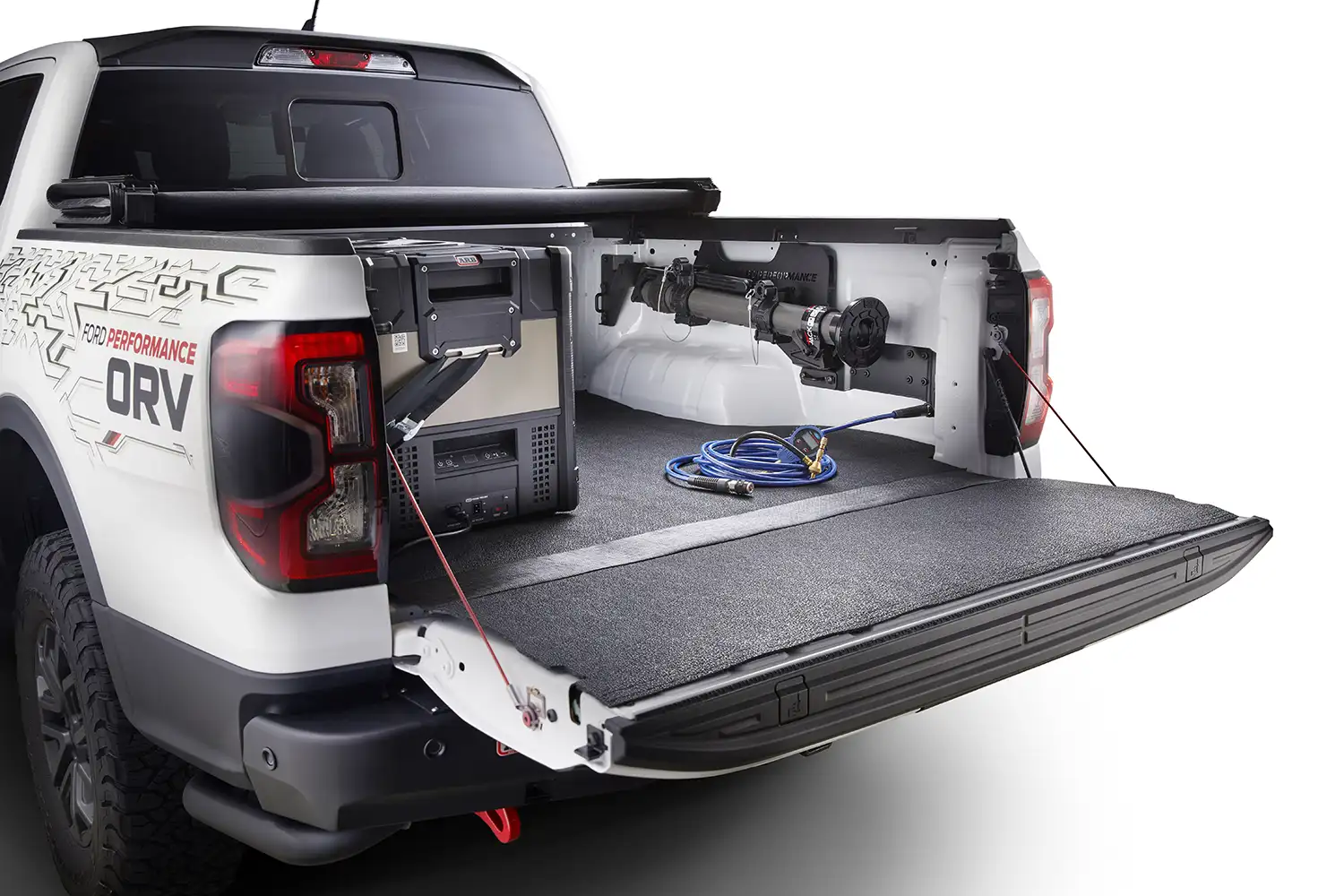 The Ranger Ford Performance Off-Road concept package* targets the overlanding space. Available on 2024 Ranger XLT and Lariat models with four-wheel-drive equipped, this package elevates the truck’s capability with an ARB overland suspension kit. ARB also provides new front and rear bumpers with additional recovery points, while an onboard air compressor, SOLIS lights, and a 47-quart refrigerator/freezer are also available.